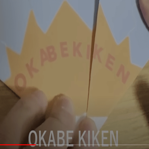 チューリップの形になるように紙を折ると、赤い文字で「OKABEKIKEN」と読める。