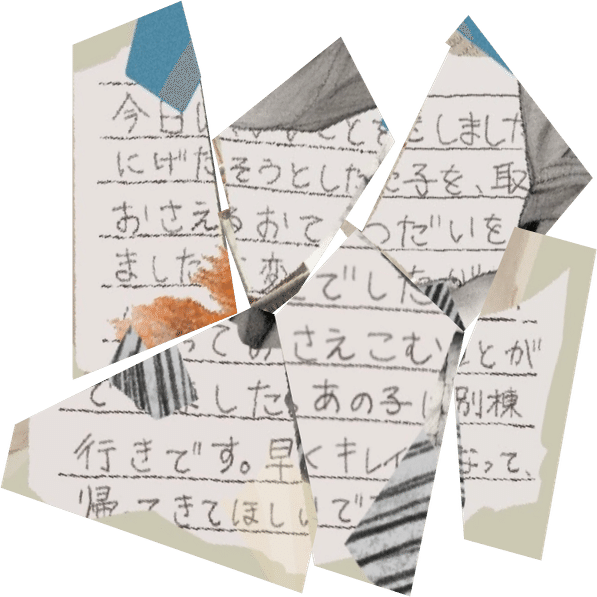 「今日●●●●とをしました。にげだそうとした子を、取●おさえるおてつだいを●ました。●変でしたが●●●っておさえこむことがで●●した。あの子●別棟行きです。早くキレイ●なって、帰ってきてほしいで●」