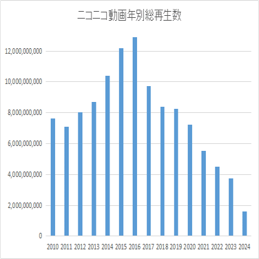 過去に生じていた「再生数」が、数億PV単位で減算されたことによって、2024年その年にやたら落ち込んでいるように見える、というもの。
