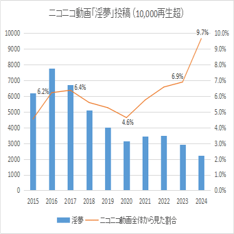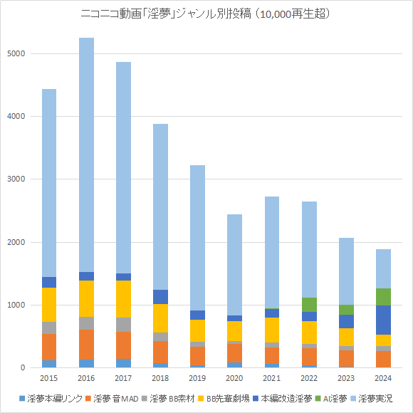 明るい話としては、ごく一部の人物が強烈に支えているきらいはあるものの、動画生成AIの急速な普及と、本編改造淫夢の伸びが著しいこと。