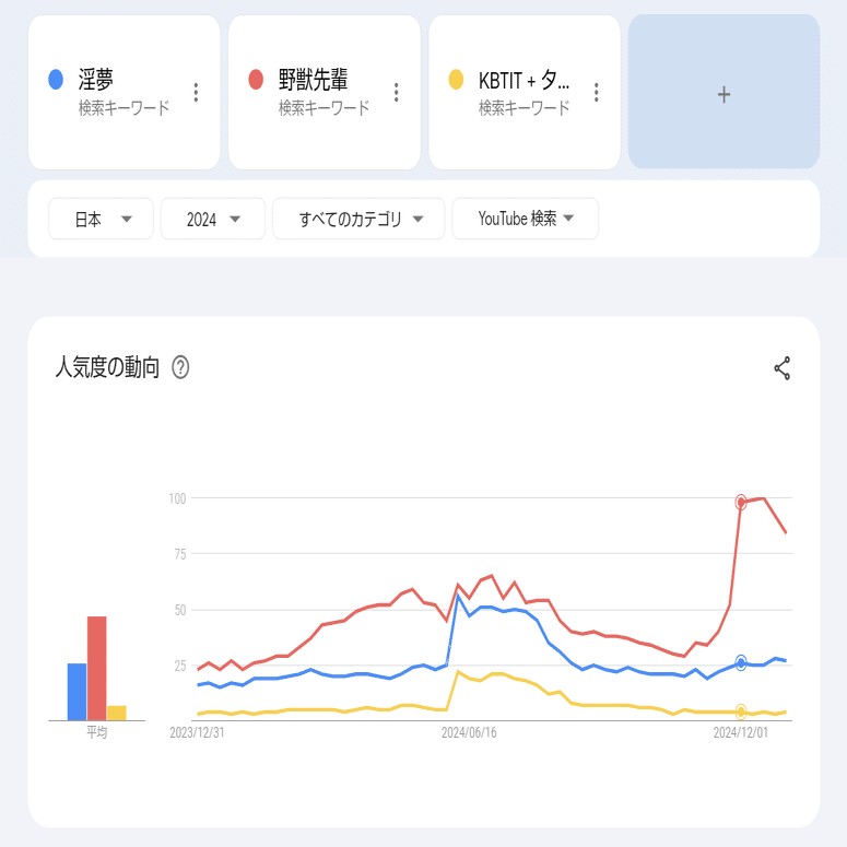その後の「野獣先輩ダンス」は振付こそ絡んでいつつも、11月半ばから展開した場はtiktokであり、それが波及してYoutube上の検索量も大きく伸びたことが確認できるが……さてニコ動への影響は?