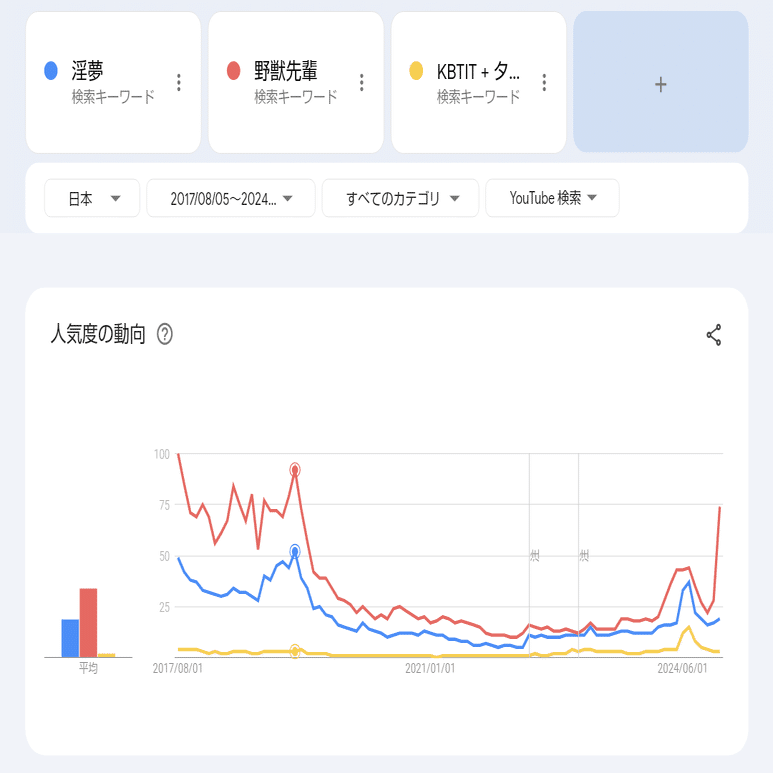 時期的にはスマホ規制等も進行し、ニコ動がガバガバでスカスカになっていくのに反し、Youtubeでの検索量は2019年03月時点まで高水準で維持された。