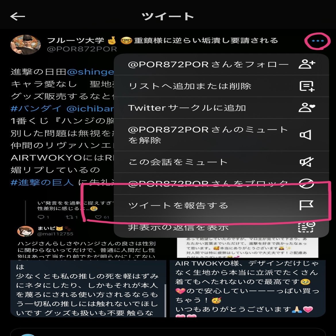 1)晒しツイートを開き、右上の「・・・」をタップし、「このツイートを報告する」を選択します。
