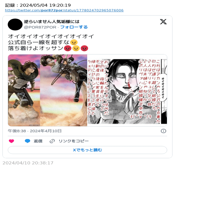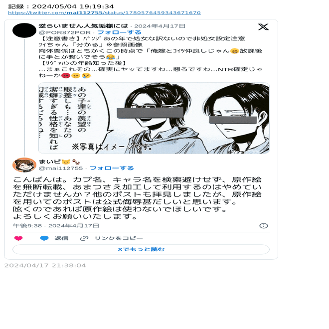 原作絵を無断転載した投稿は減らず、寧ろ加工したり、推しカプ名を検索避けもせず処女、非処女などの発言が続いたため、Aさんの言葉をお借りし、「公式侮辱」と強い言葉を使い、せめて原作絵の転載はやめて欲しい旨のリプライをしました。