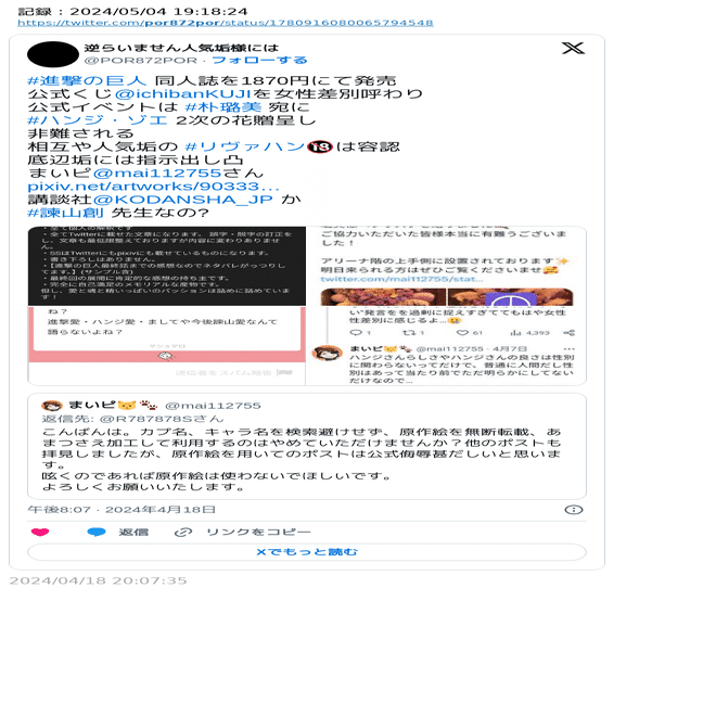 許可ない同人販売#進撃の巨人 公式無断転載