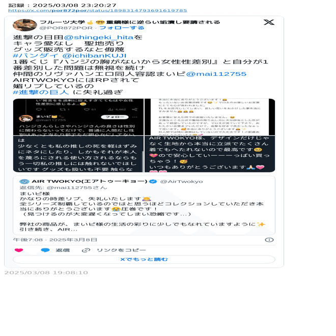 1番くじ『ハンジの胸がないから女性性差別』と自分が1番差別した問題は無視を続け