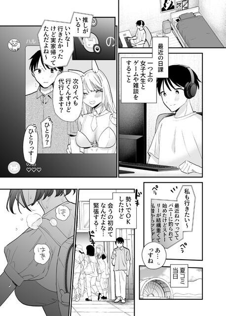 【エロ漫画】童貞オタクくんがネトゲで知り合った高身長地雷系女子とカラダの関係を持ってしまいザーメンを搾り取られちゃう!