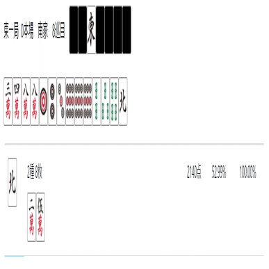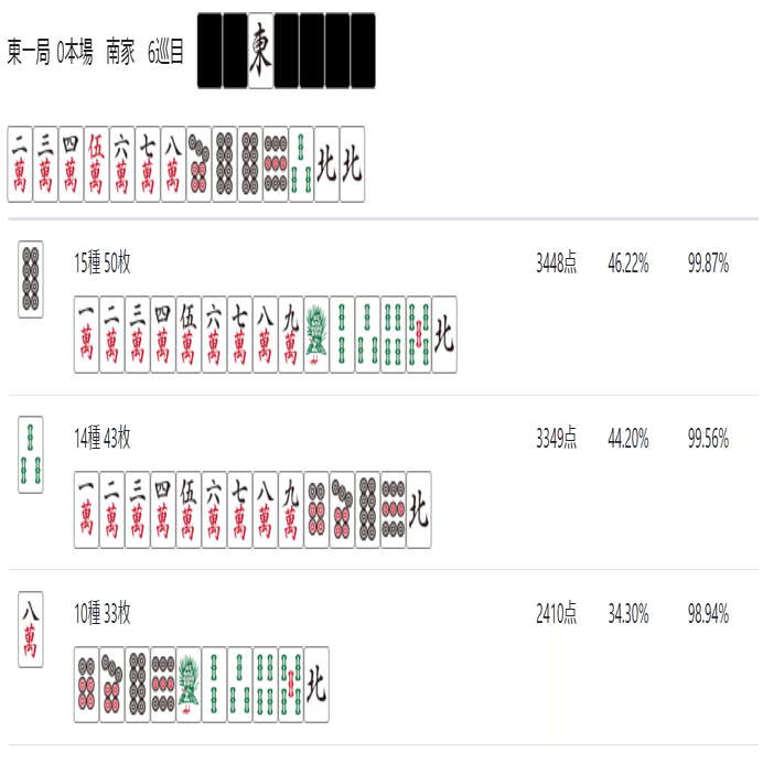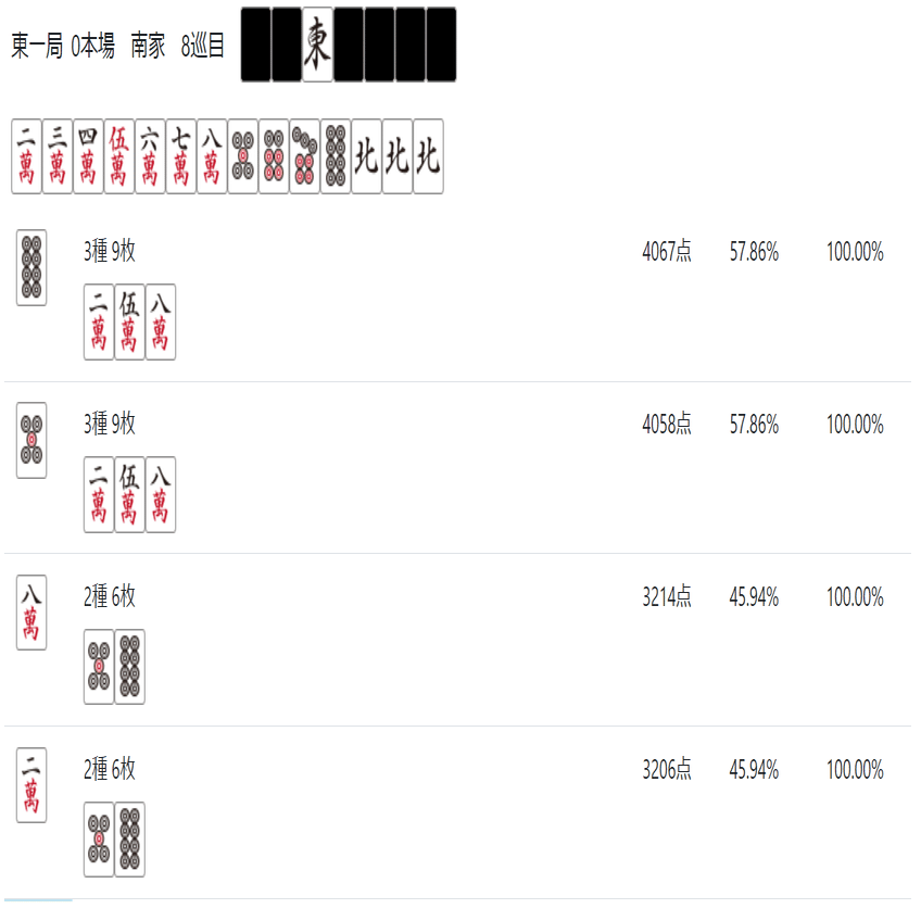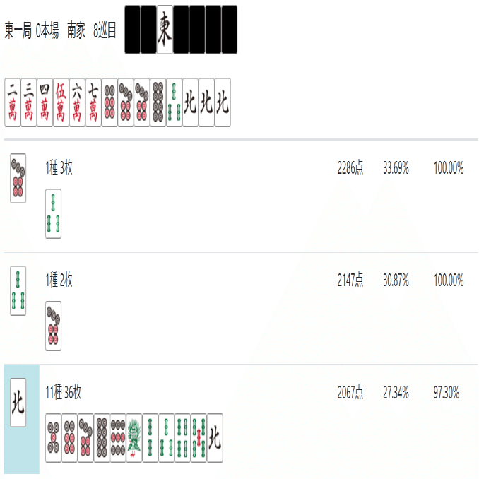 北が暗刻になった場合も8pを切れば258m待ちに取ることが出来る。ちなみにこのような複数の単騎待ちになる形を「ノベタン」と呼ぶ。