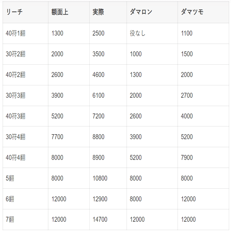 なぜこれほどまでにリーチが優位なのだろうか?リーチのアガリ打点の表を見てほしい。