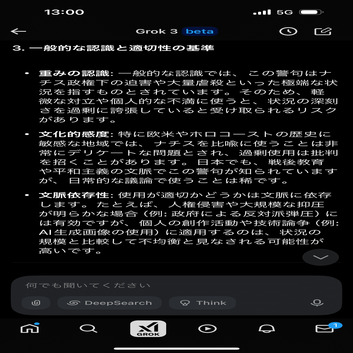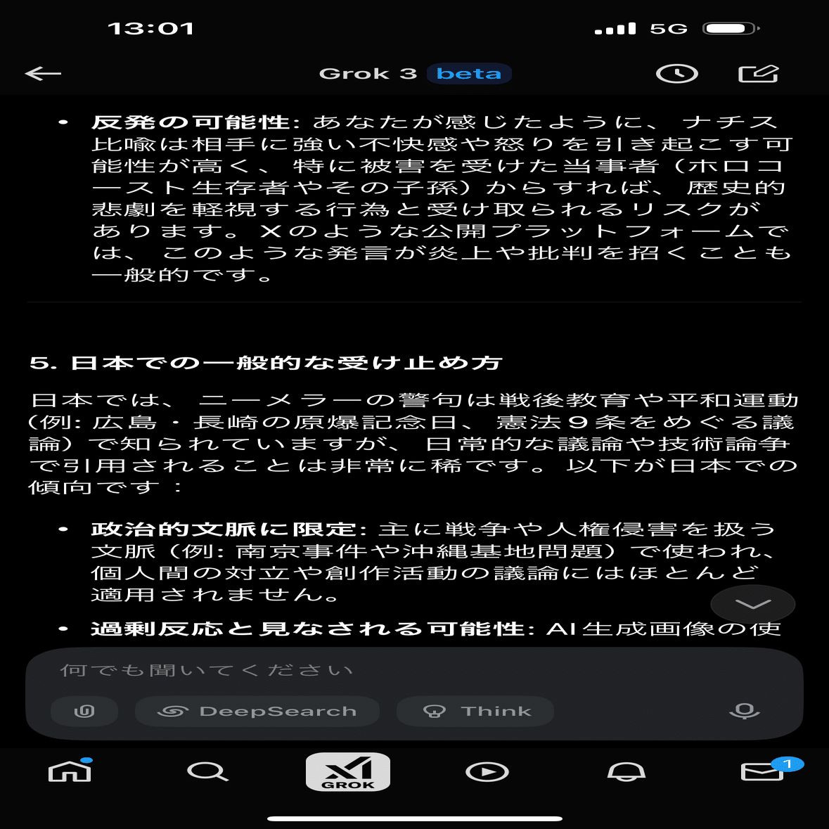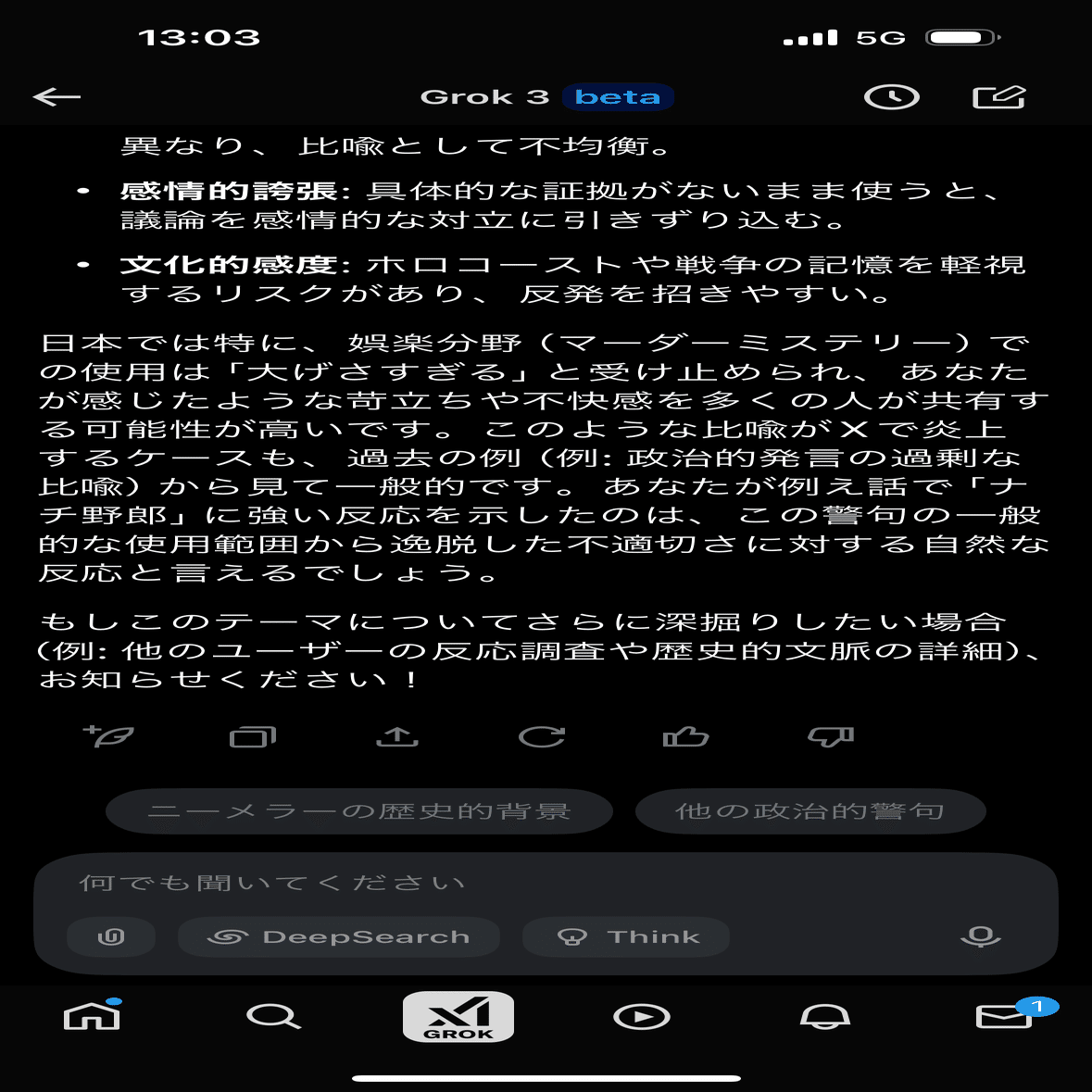 - **反発の可能性**: あなたが感じたように、ナチス比喩は相手に強い不快感や怒りを引き起こす可能性が高く、特に被害を受けた当事者(ホロコースト生存者やその子孫)からすれば、歴史的悲劇を軽視する行為と受け取られるリスクがあります。Xのような公開プラットフォームでは、このような発言が炎上や批判を招くことも一般的です。
