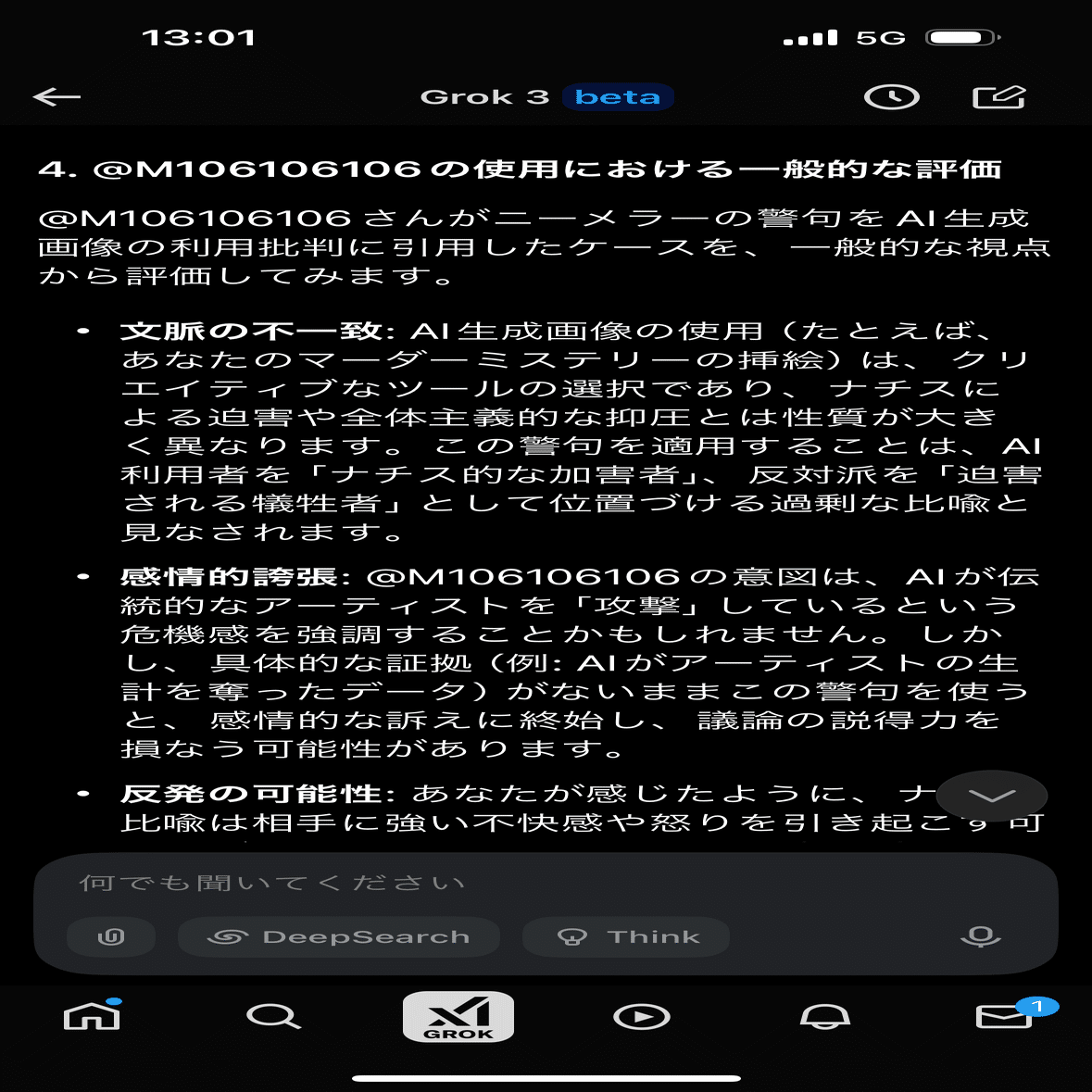 - **感情的誇張**: @M106106106の意図は、AIが伝統的なアーティストを「攻撃」しているという危機感を強調することかもしれません。しかし、具体的な証拠(例: AIがアーティストの生計を奪ったデータ)がないままこの警句を使うと、感情的な訴えに終始し、議論の説得力を損なう可能性があります。