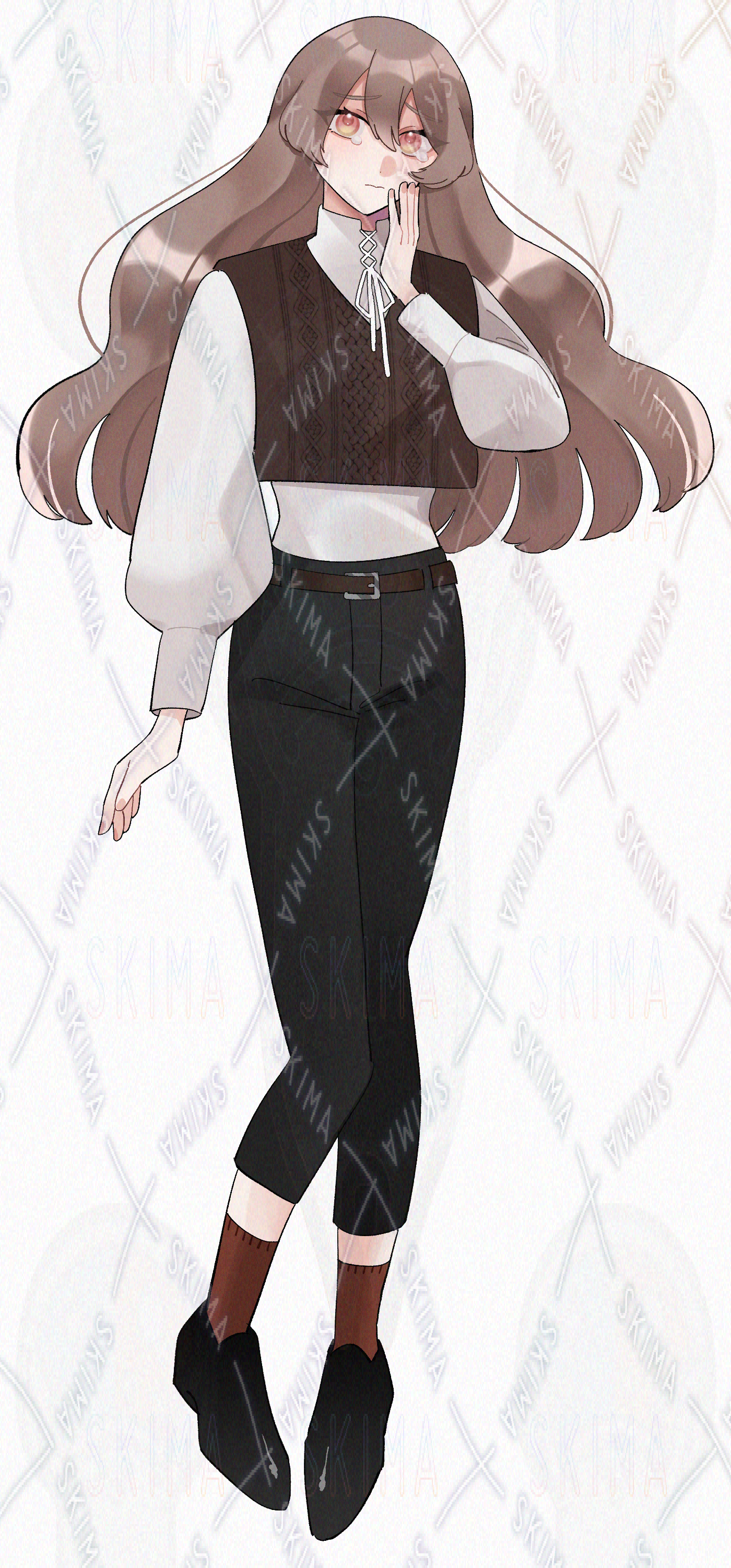 ニットベストを着た茶髪ウェーブヘアの女性の立ち絵です。