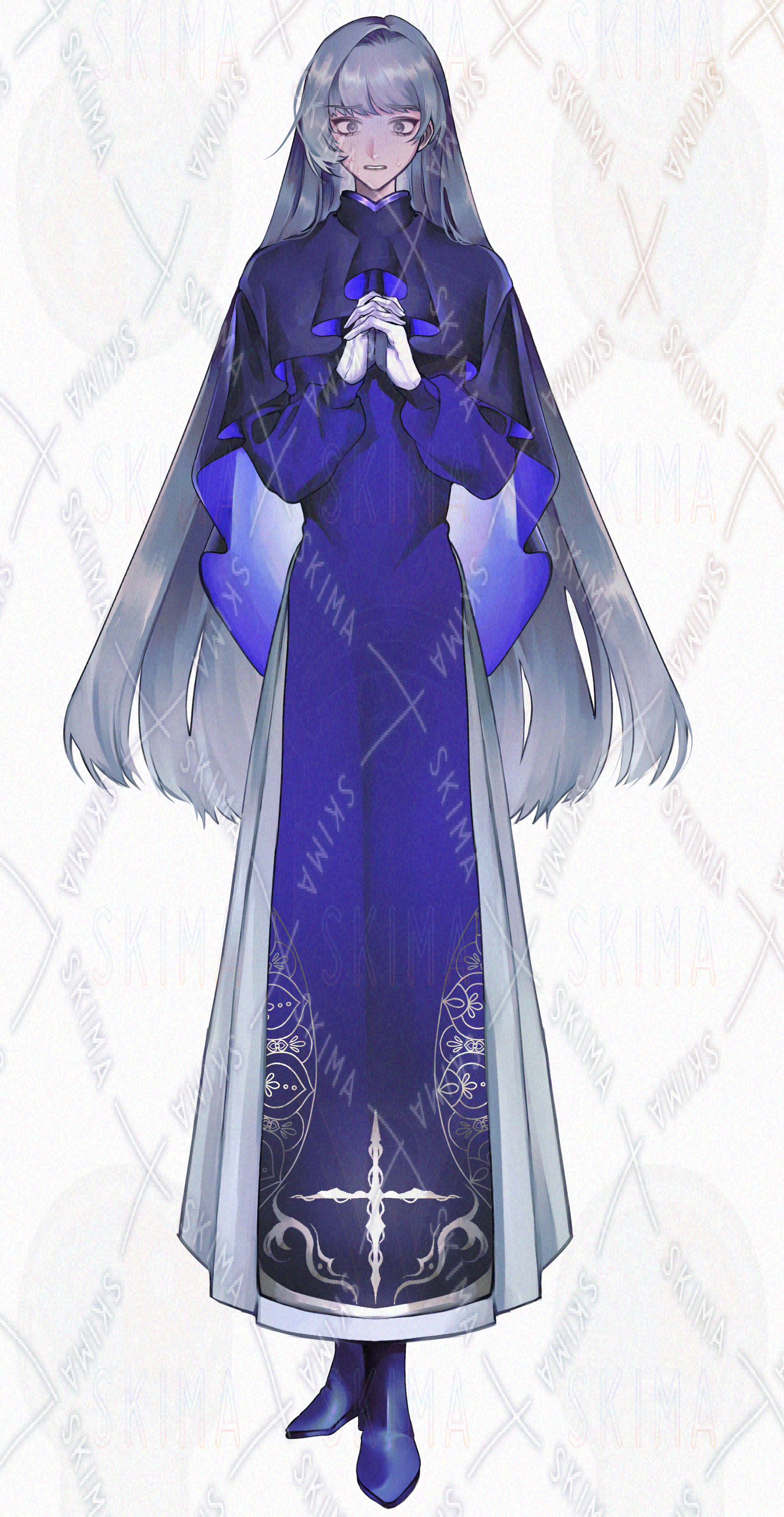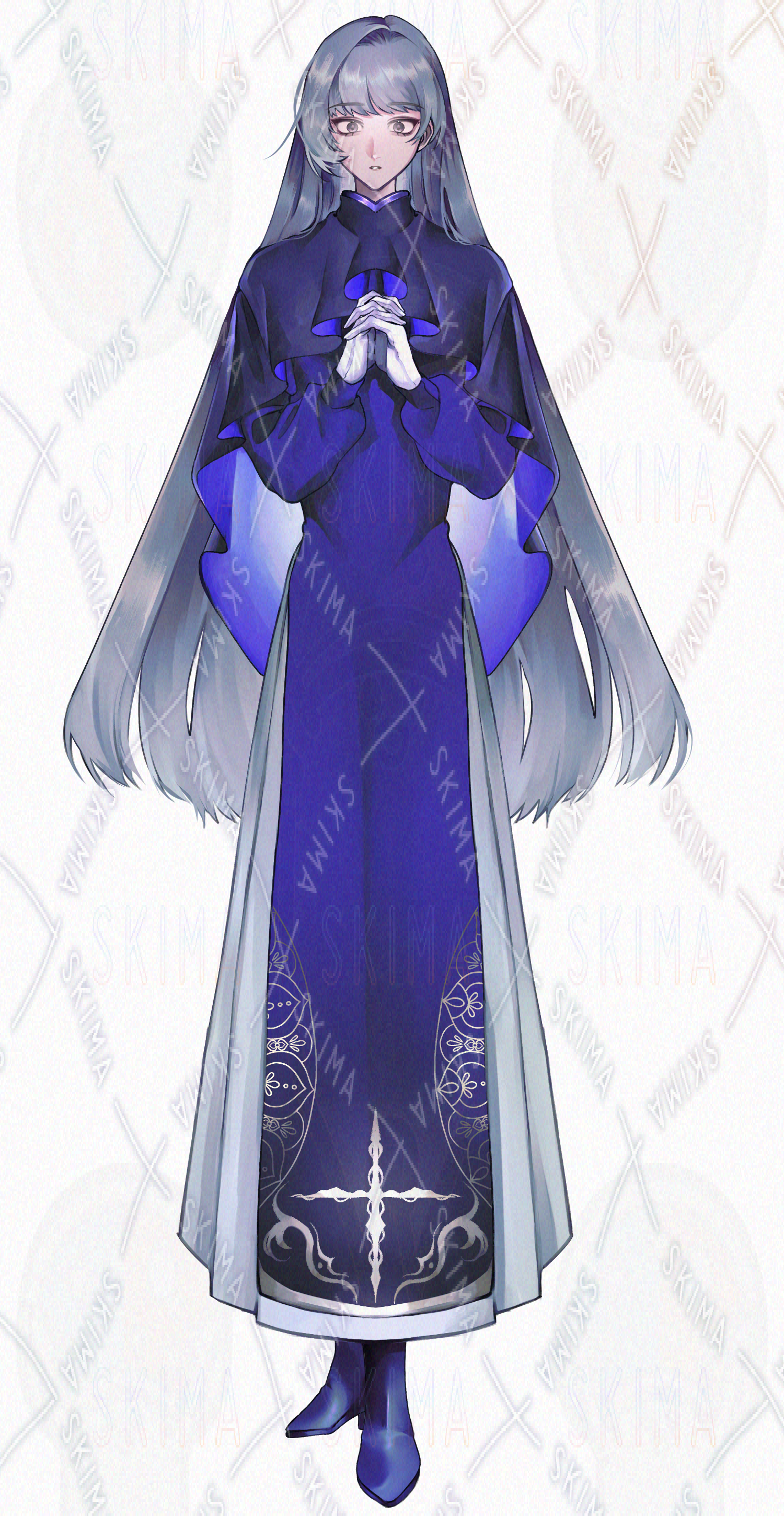 青が神秘的な聖職者風のキャラクターです。