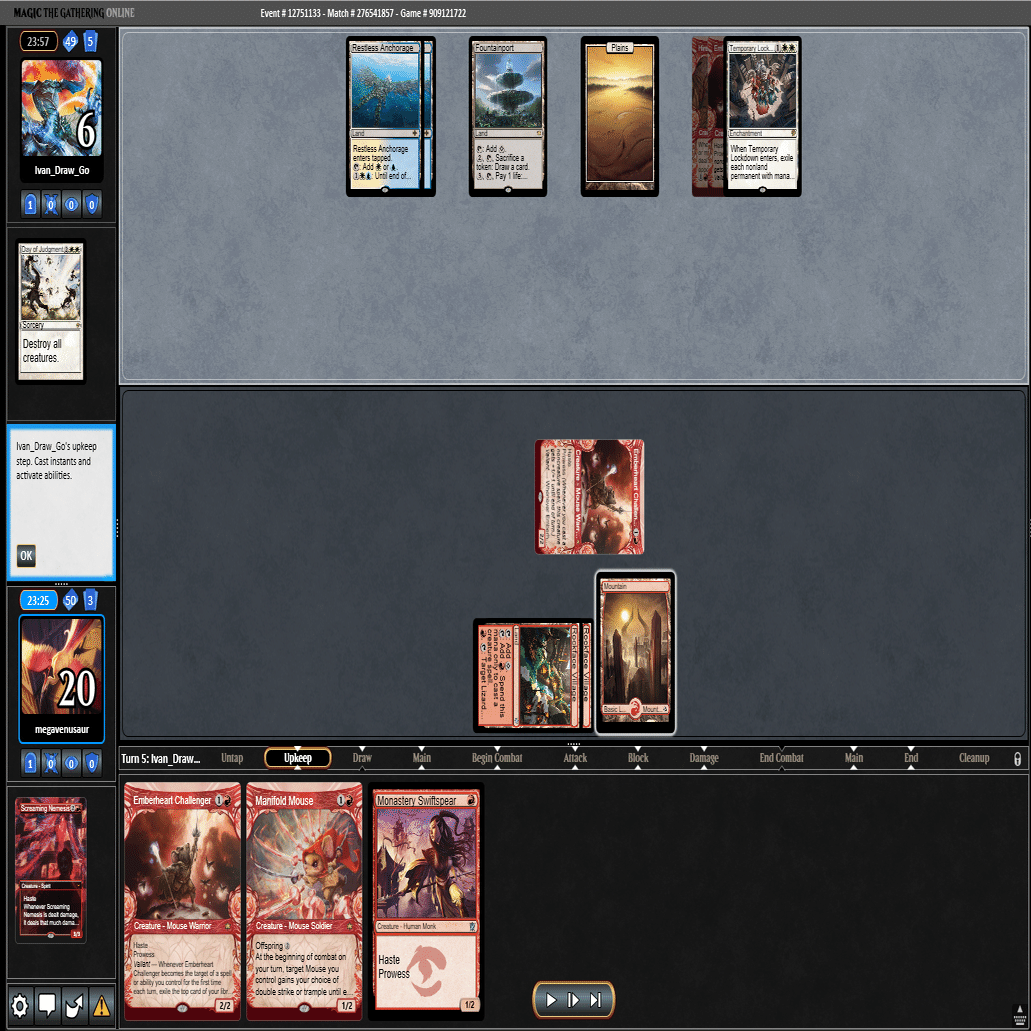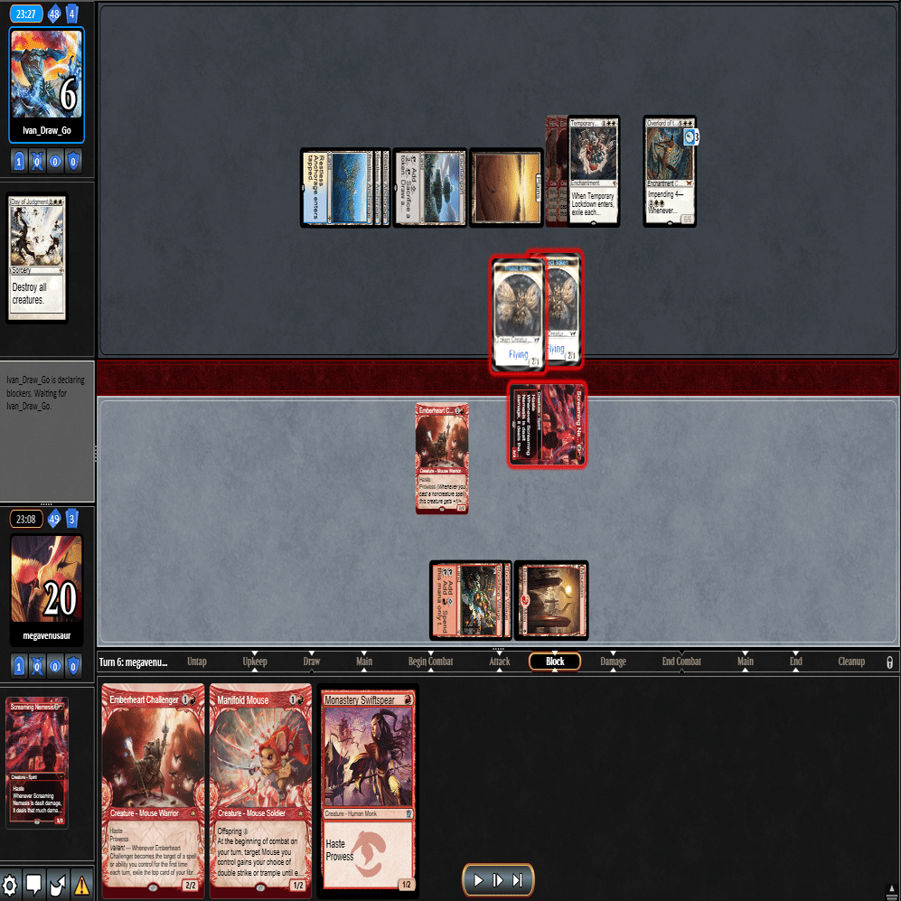 予想通り3ターン目に≪一時的封鎖≫をプレイされ、4ターン目はトップした≪叫ぶ宿敵≫を走らせた返しに≪審判の日≫で除去された5ターン目。