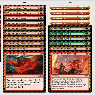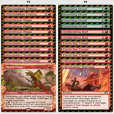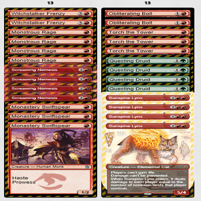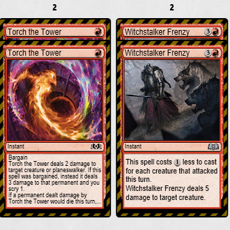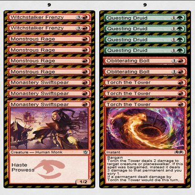 Out:≪巨怪な怒り≫2枚、≪僧院の速槍≫2枚、≪稲妻の一撃≫4枚、≪魔女跡追いの激情≫2枚