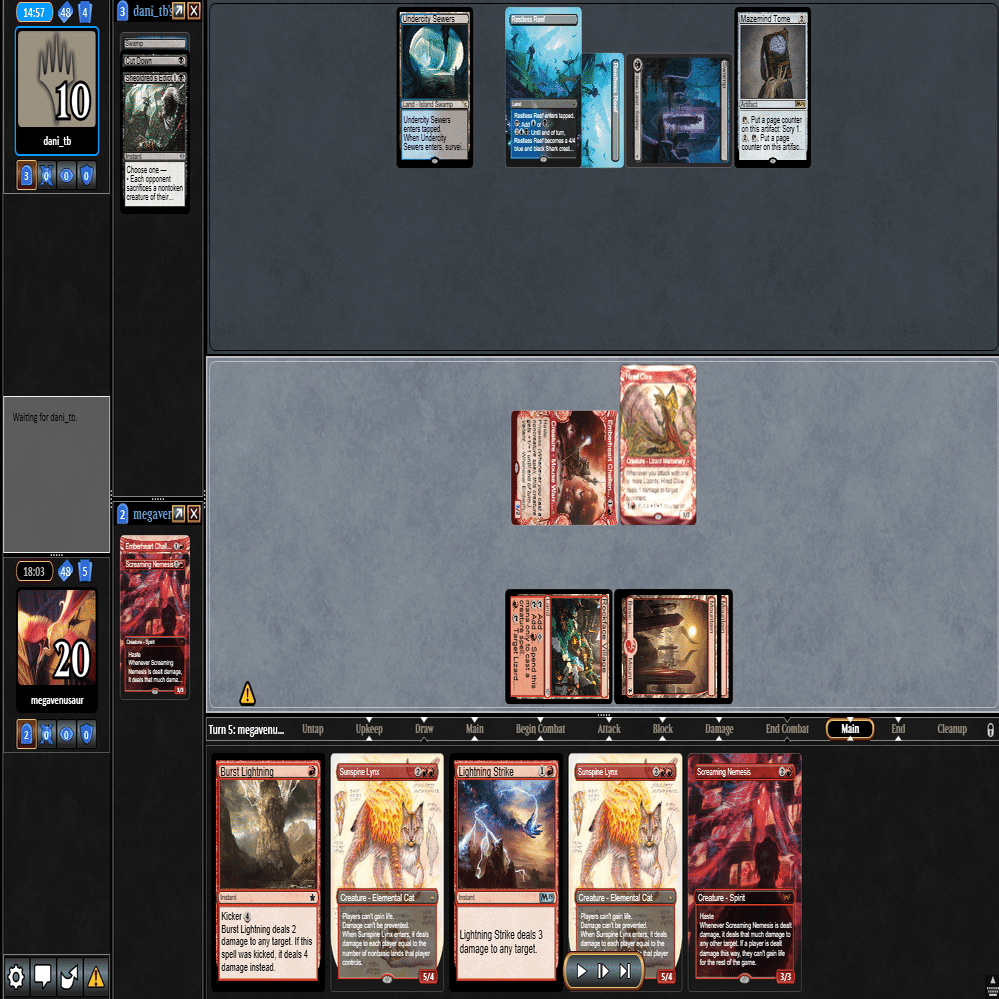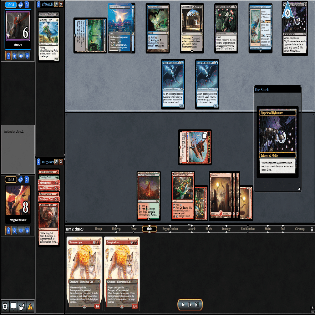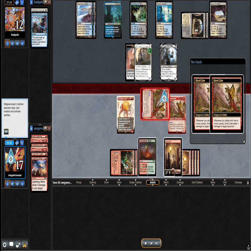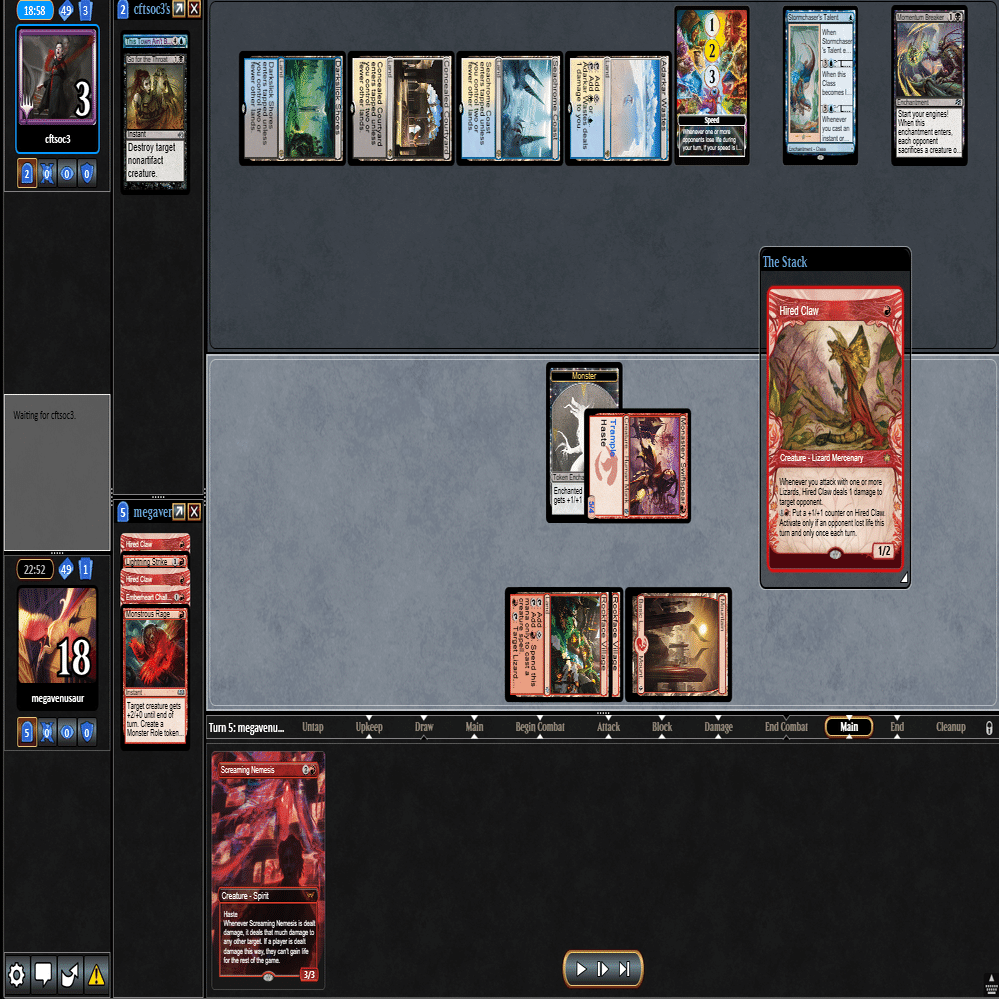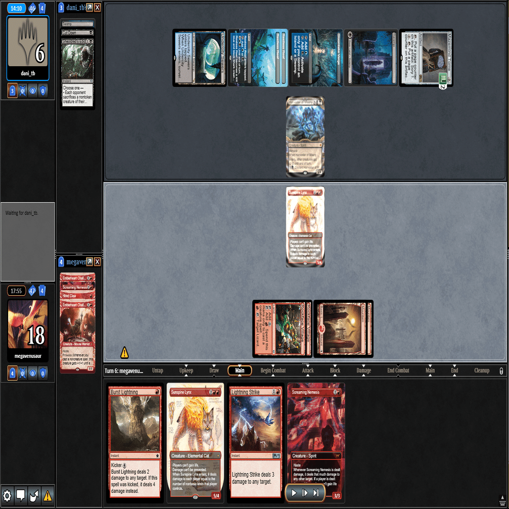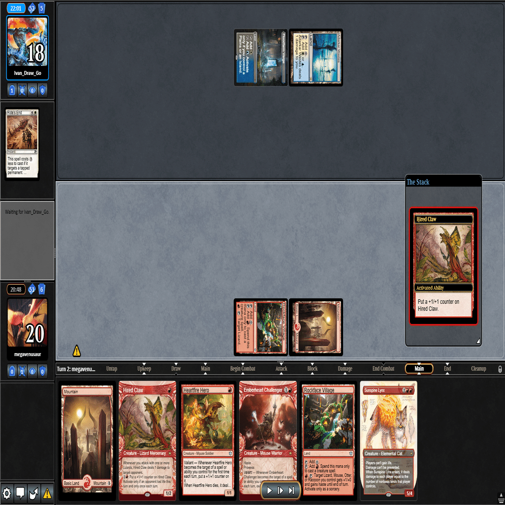 前のターンの≪雇われ爪≫は≪呪詛術師≫でブロックされ、≪逃げ場なし≫と≪勢い挫き≫で全て除去された場面。