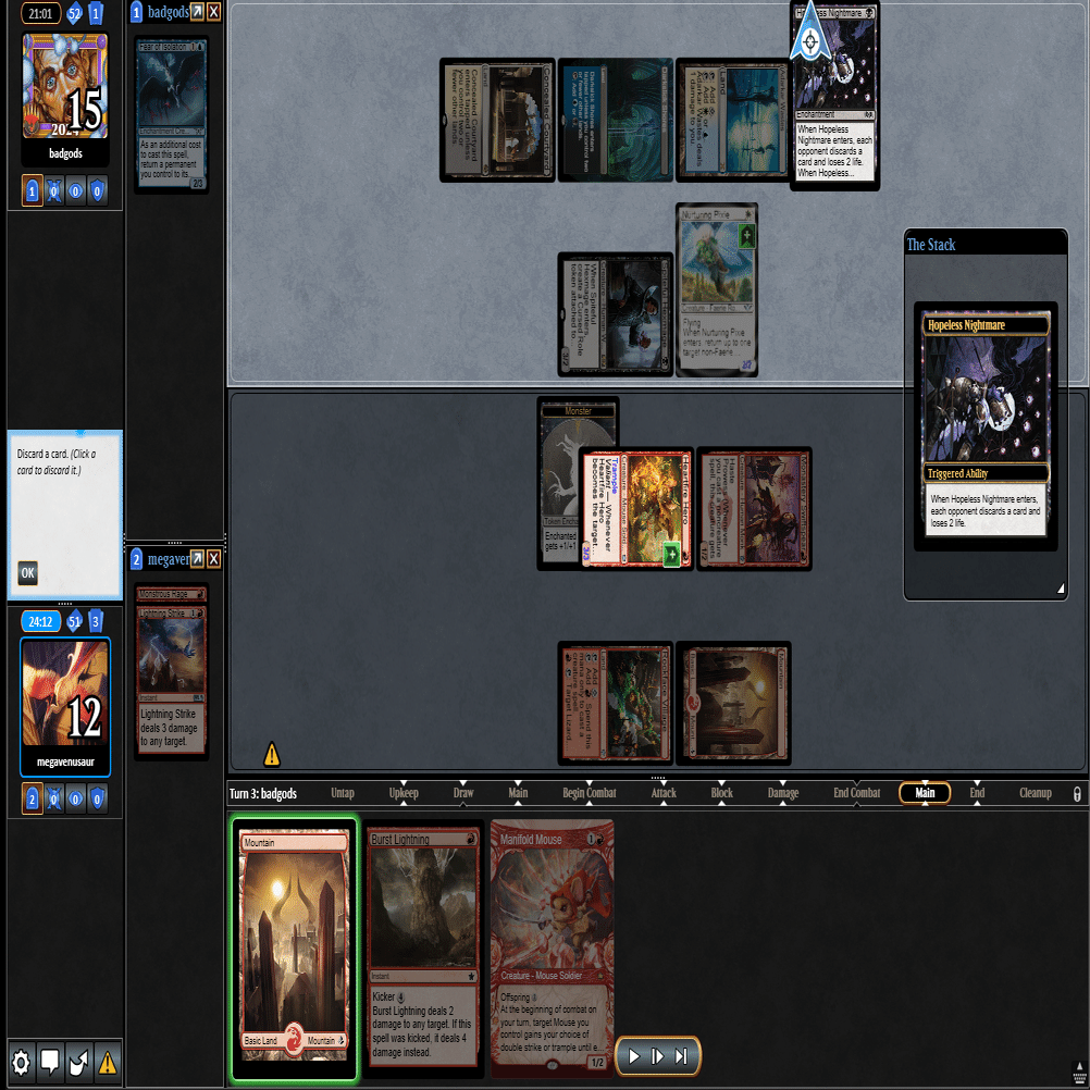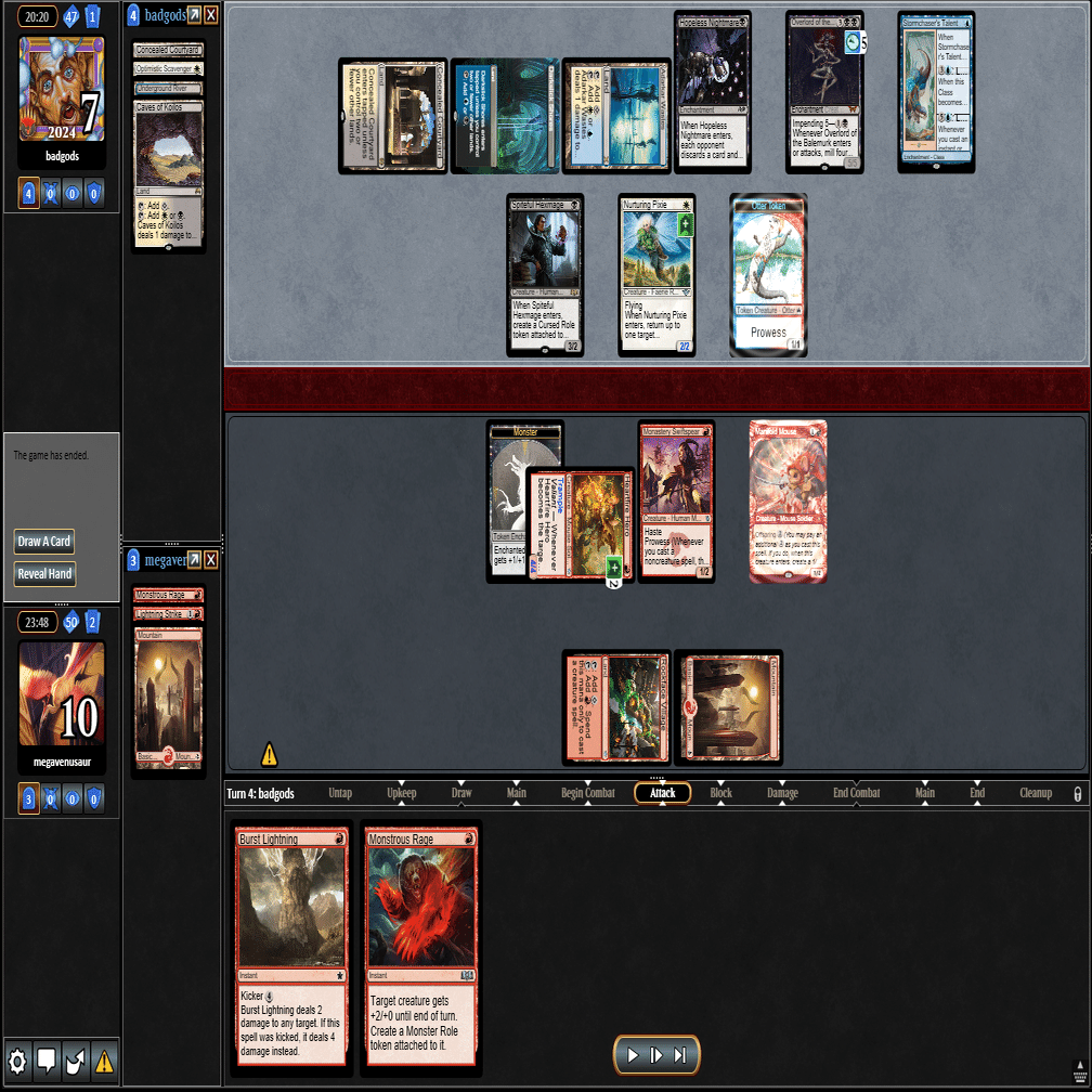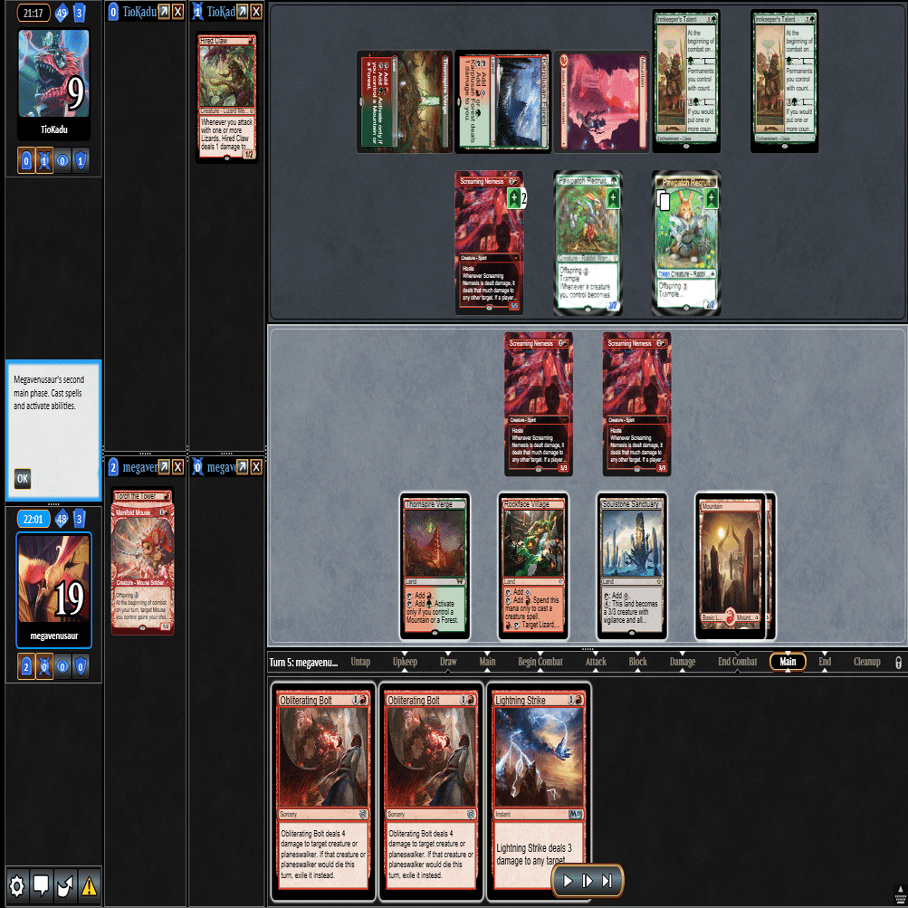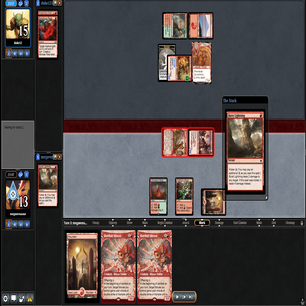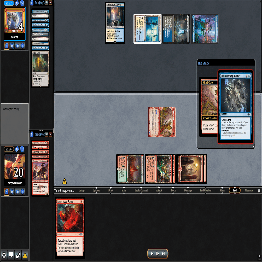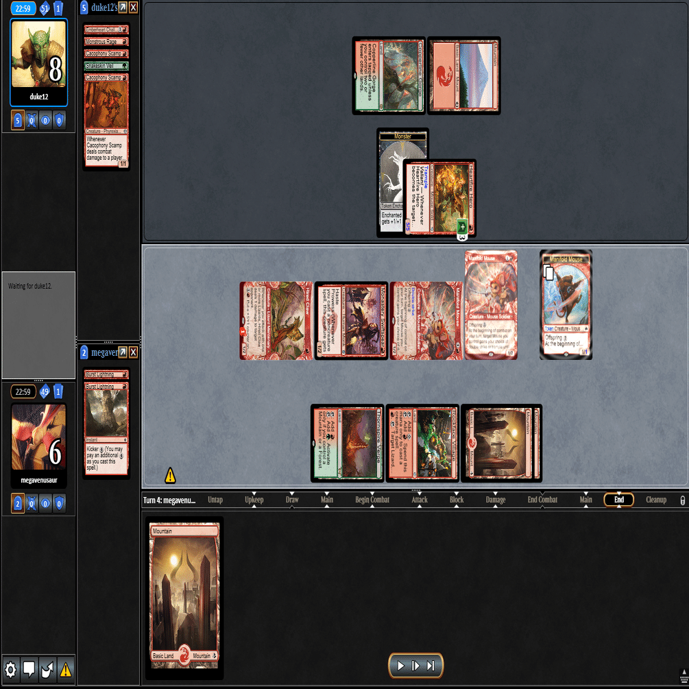 前のターンの≪雇われ爪≫は≪呪詛術師≫でブロックされ、≪逃げ場なし≫と≪勢い挫き≫で全て除去された場面。