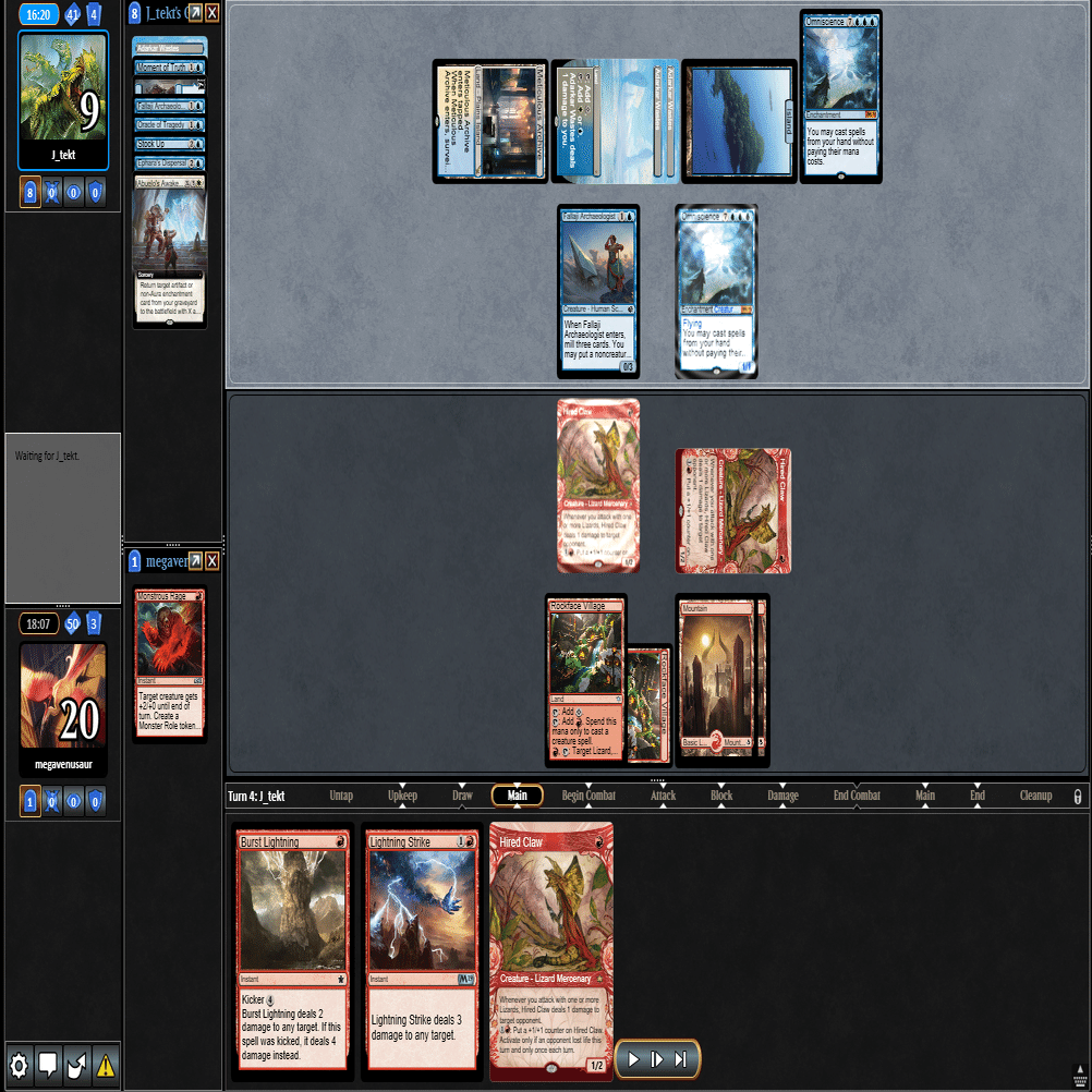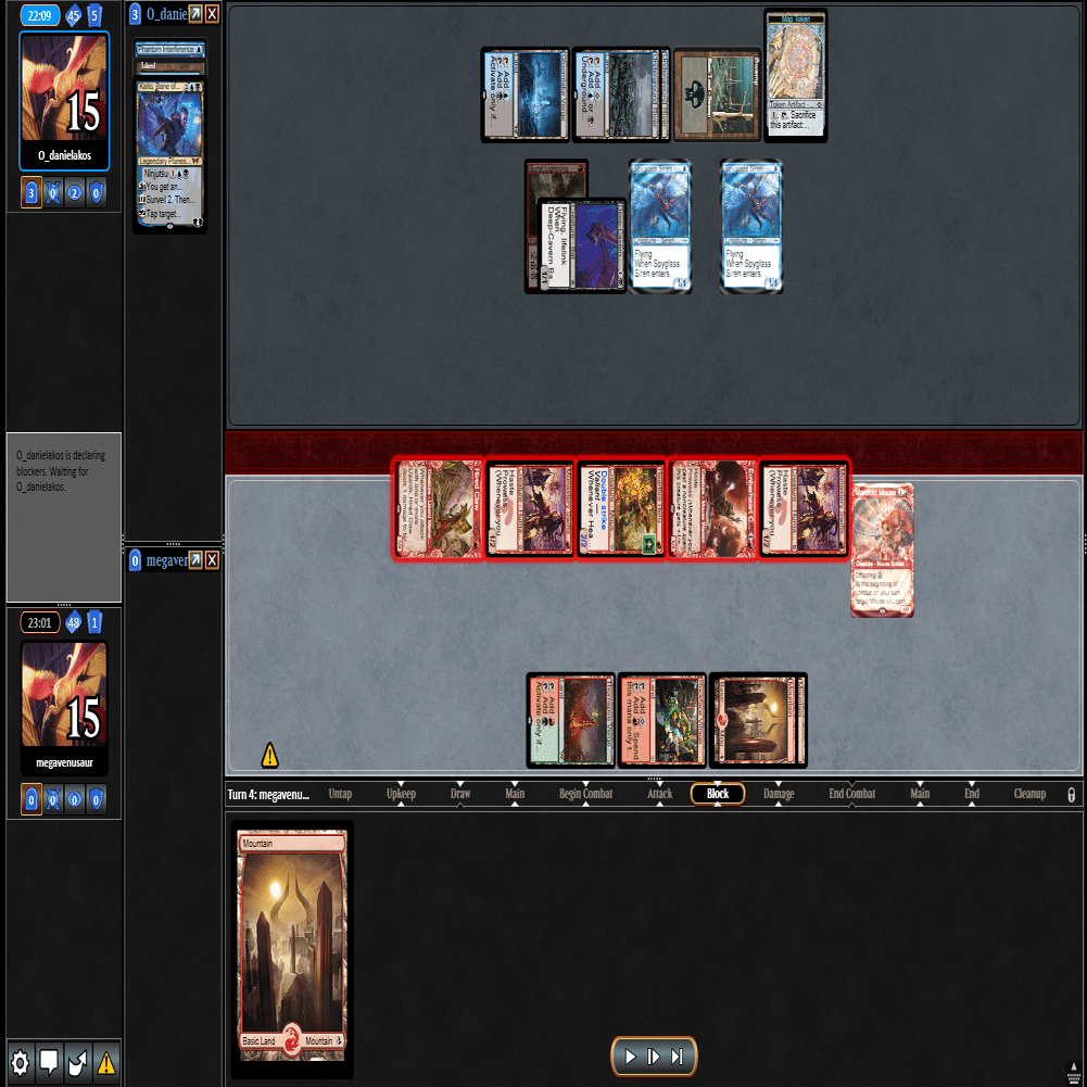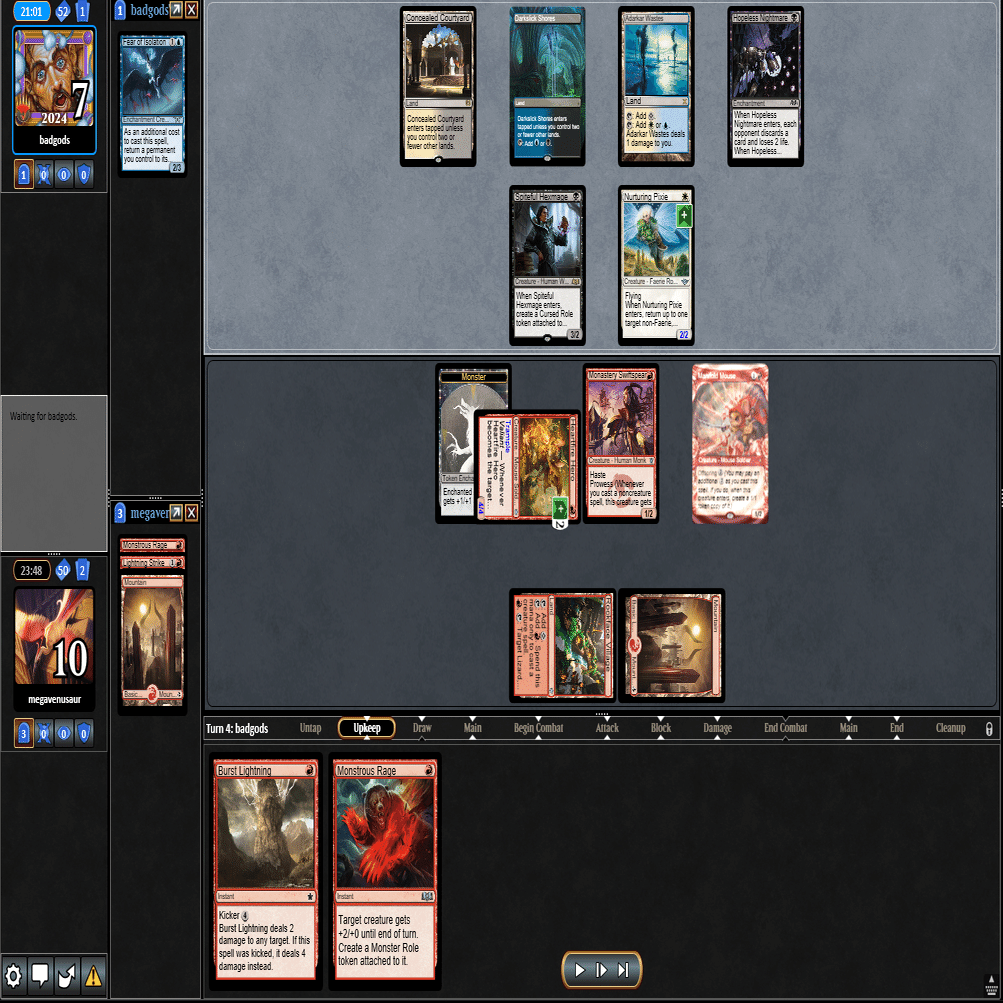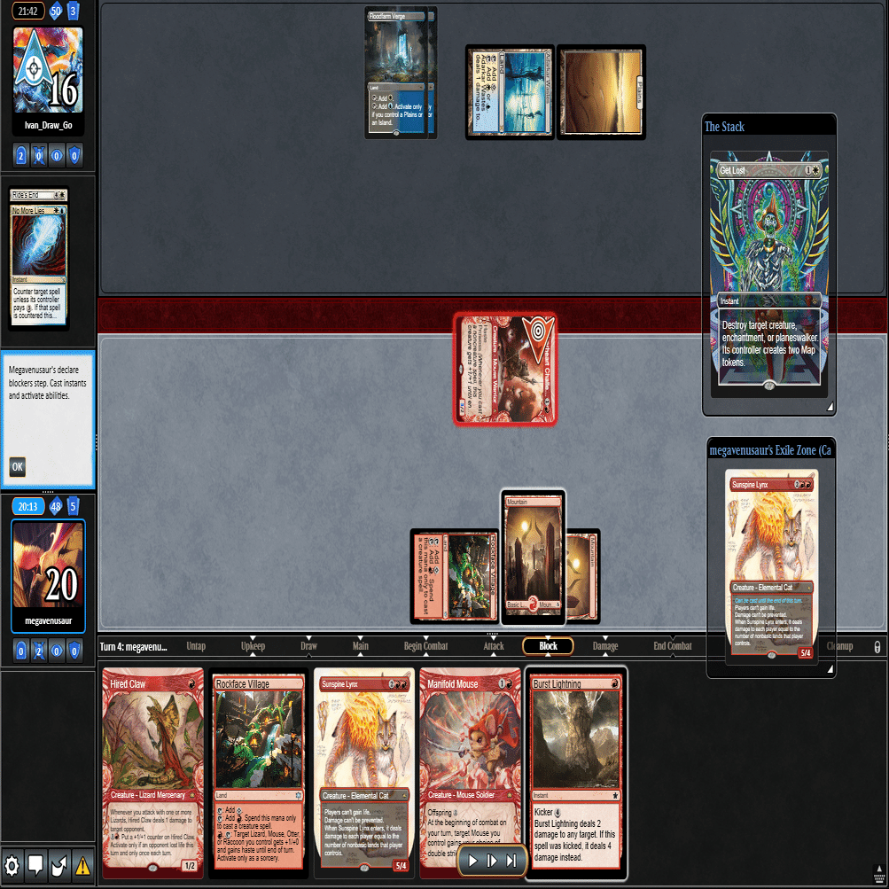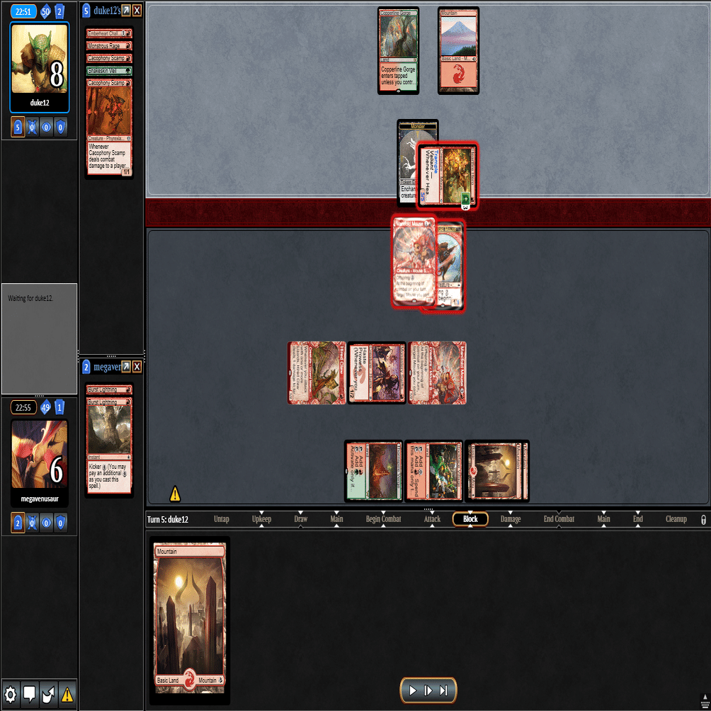 前のターンの≪雇われ爪≫は≪呪詛術師≫でブロックされ、≪逃げ場なし≫と≪勢い挫き≫で全て除去された場面。