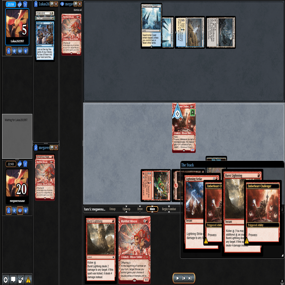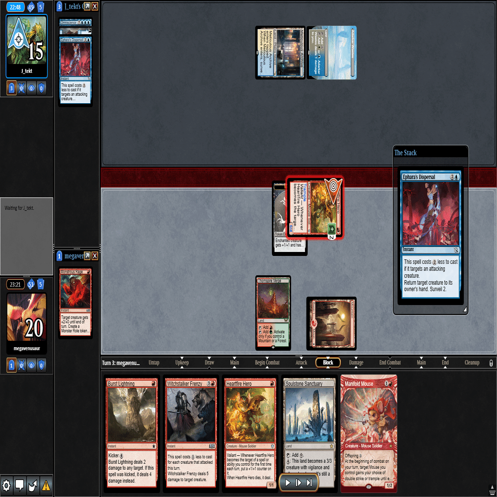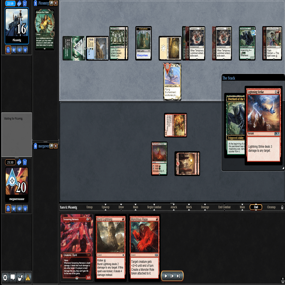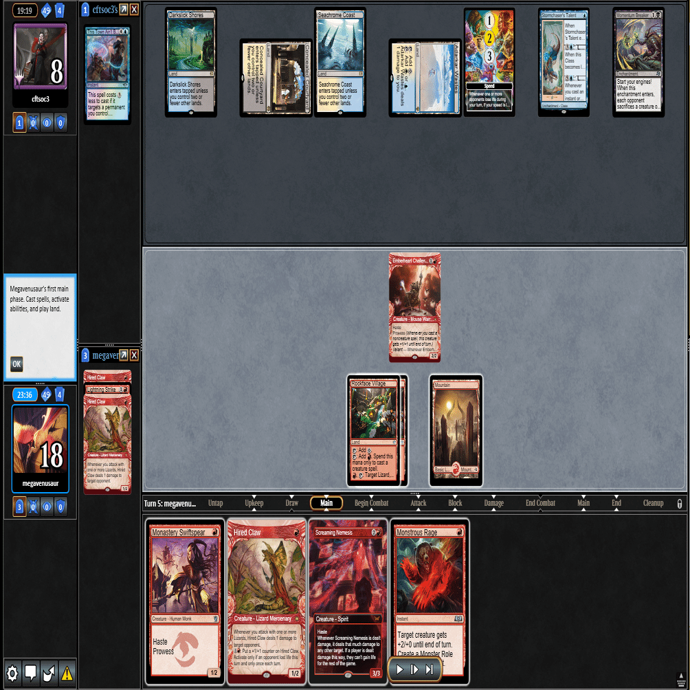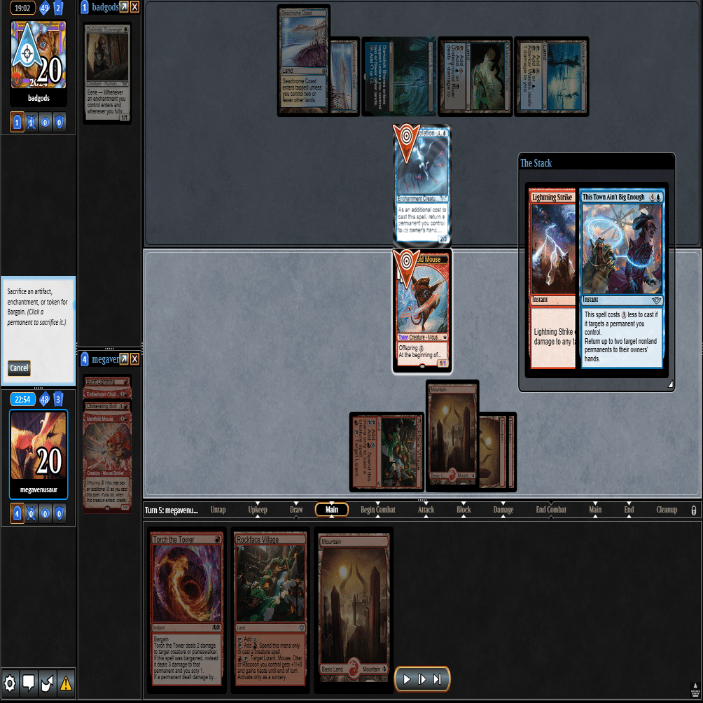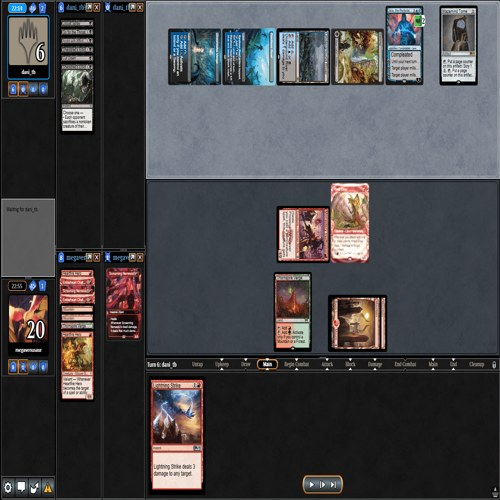 前のターンの≪雇われ爪≫は≪呪詛術師≫でブロックされ、≪逃げ場なし≫と≪勢い挫き≫で全て除去された場面。