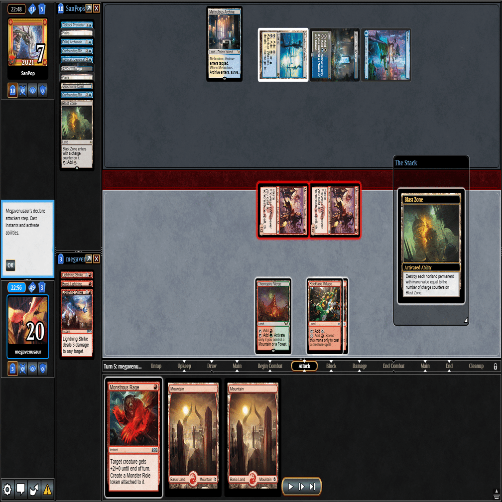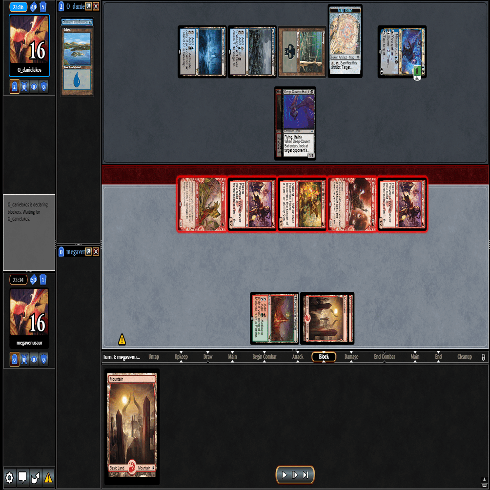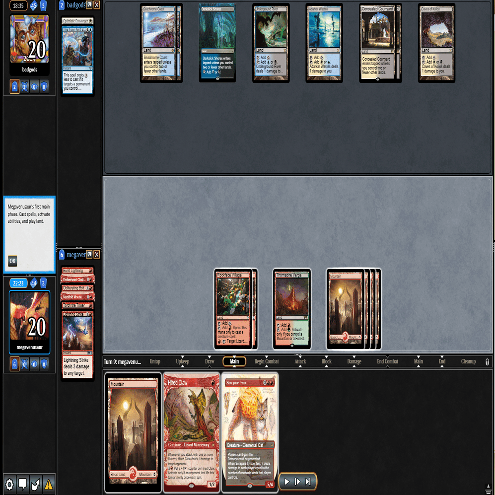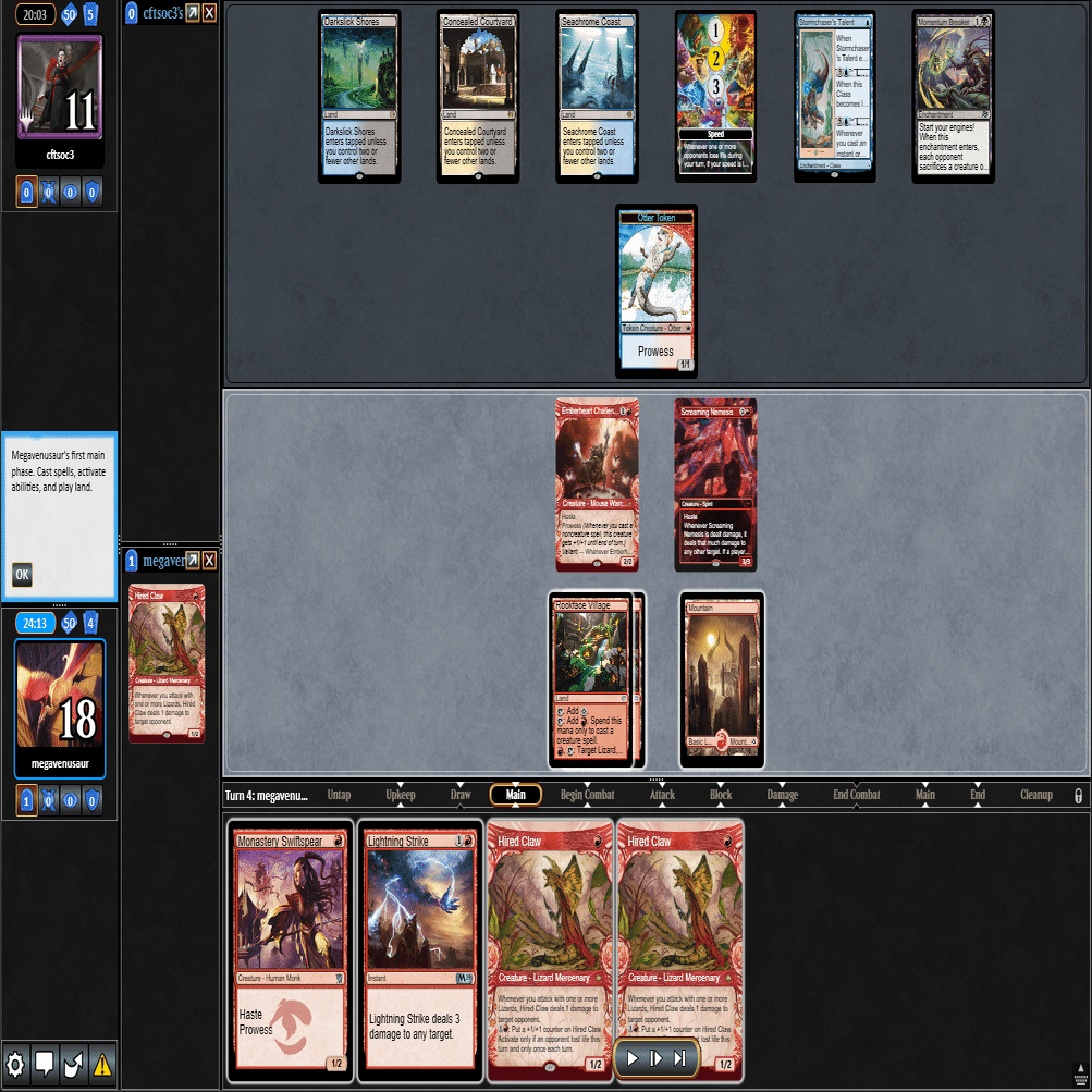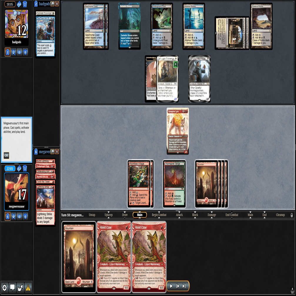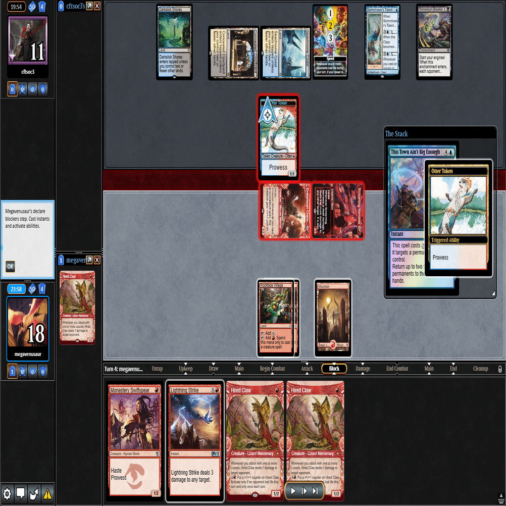 前のターンの≪雇われ爪≫は≪呪詛術師≫でブロックされ、≪逃げ場なし≫と≪勢い挫き≫で全て除去された場面。