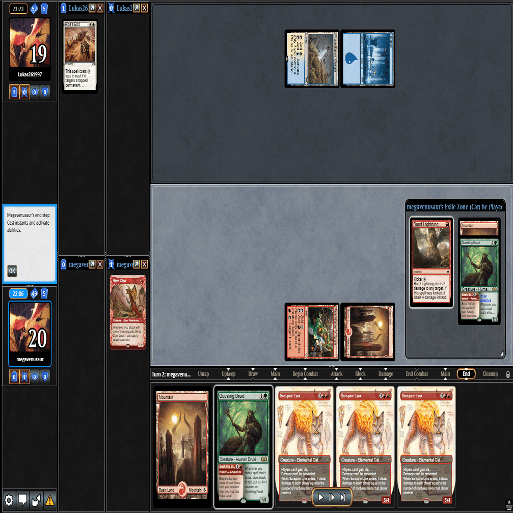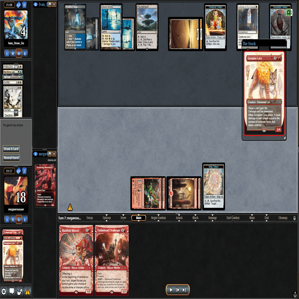 5ターン目の返しに≪太陽降下≫で≪雇われ爪≫と≪叫ぶ宿敵≫をまとめて対処され≪領事の権限≫を貼られるも、6ターン目と7ターン目に手札とトップしてきた≪オオヤマネコ≫を連打して勝利することができました。