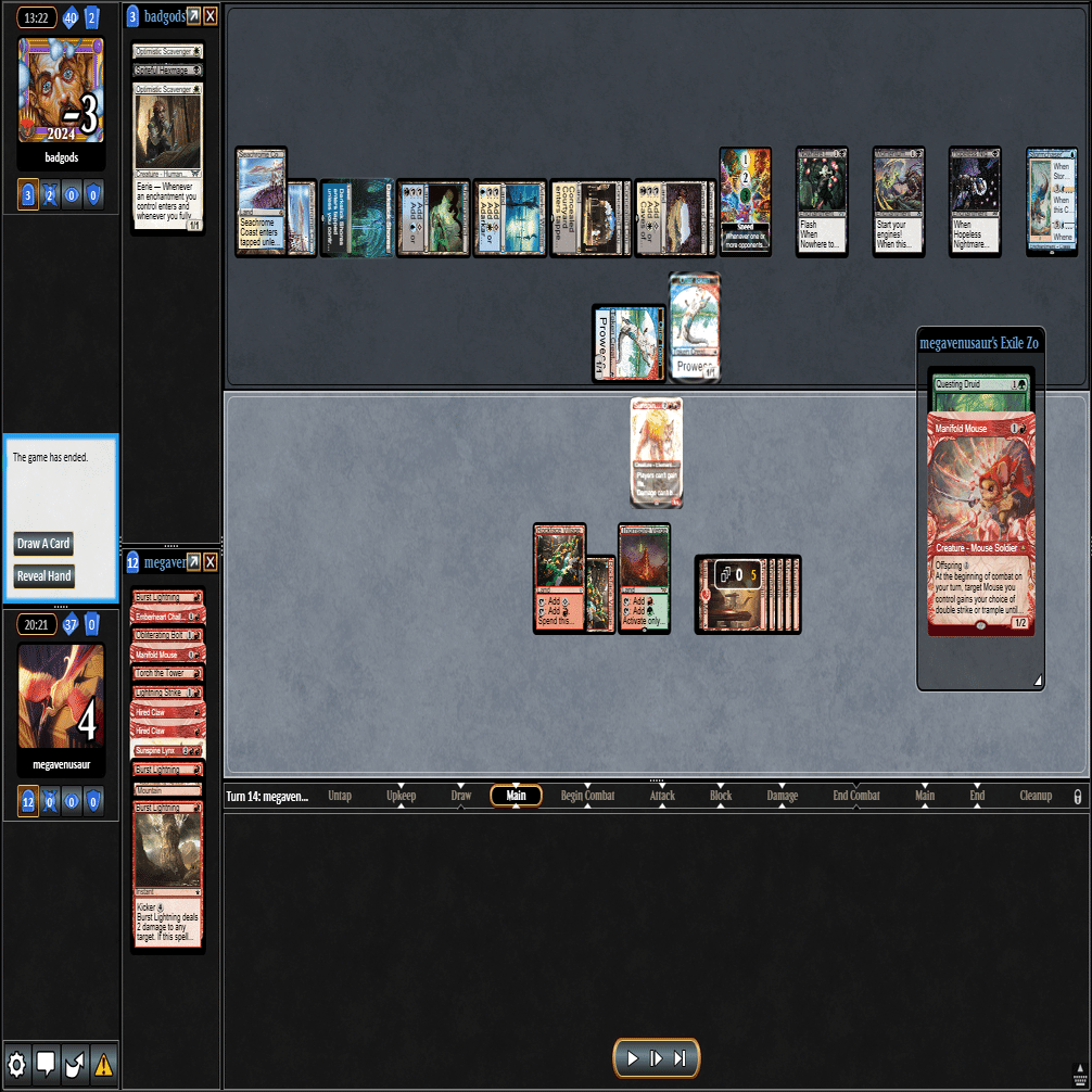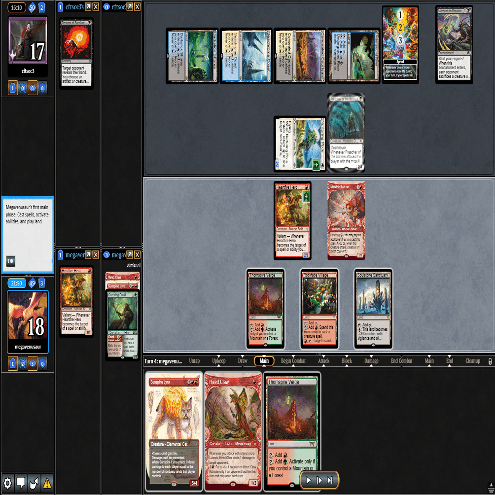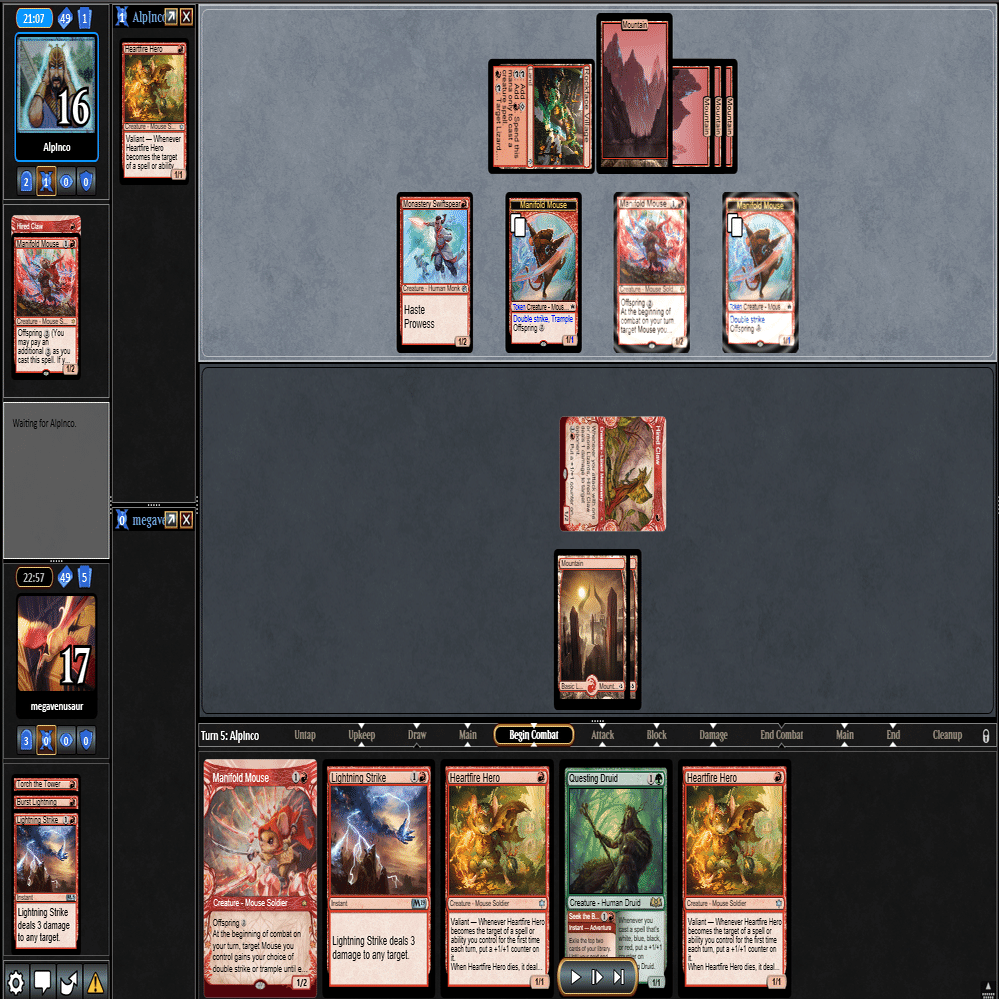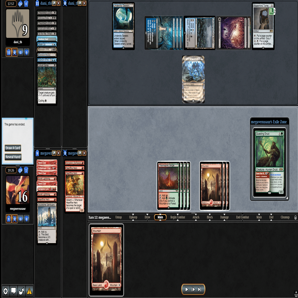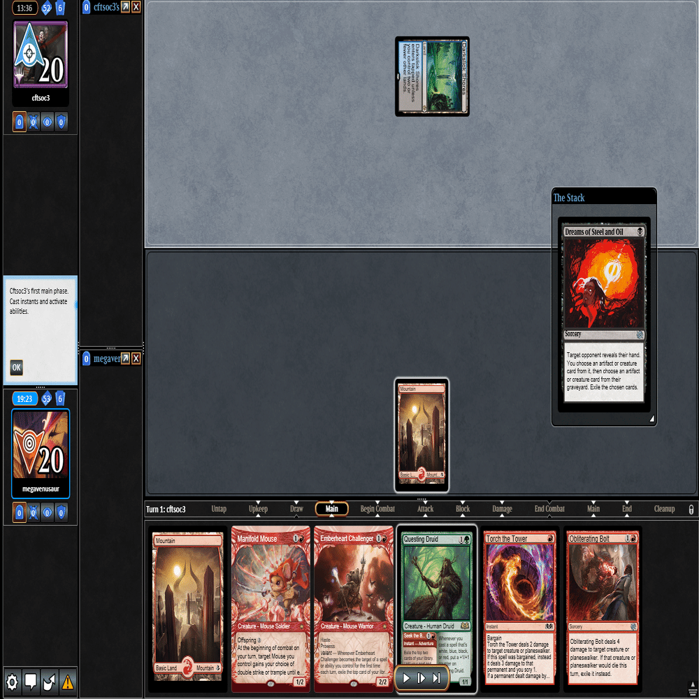 3ターン目に≪心火の英雄≫+≪多様な鼠≫の返しに≪鋼と油の夢≫で≪探索するドルイド≫を抜かれ、≪分派の説教者≫を出された場面。
