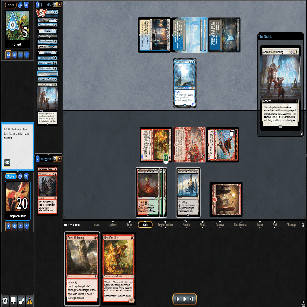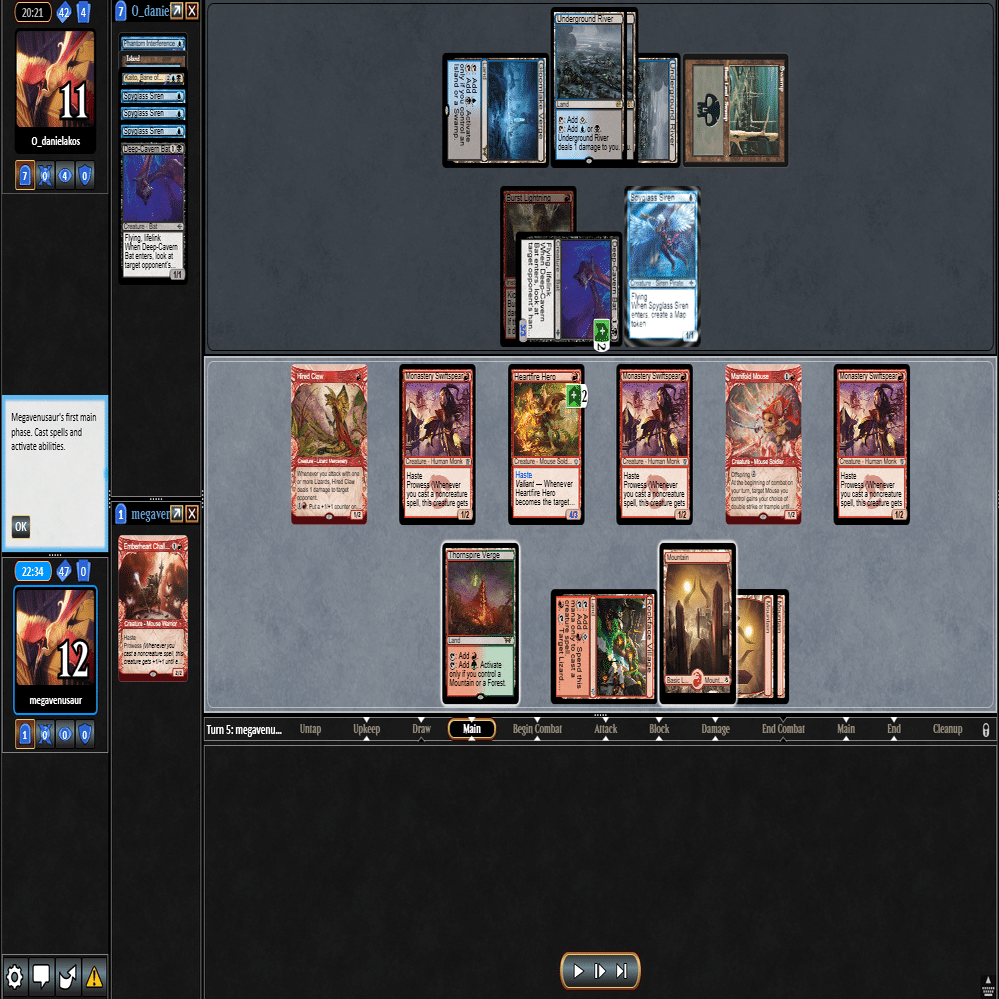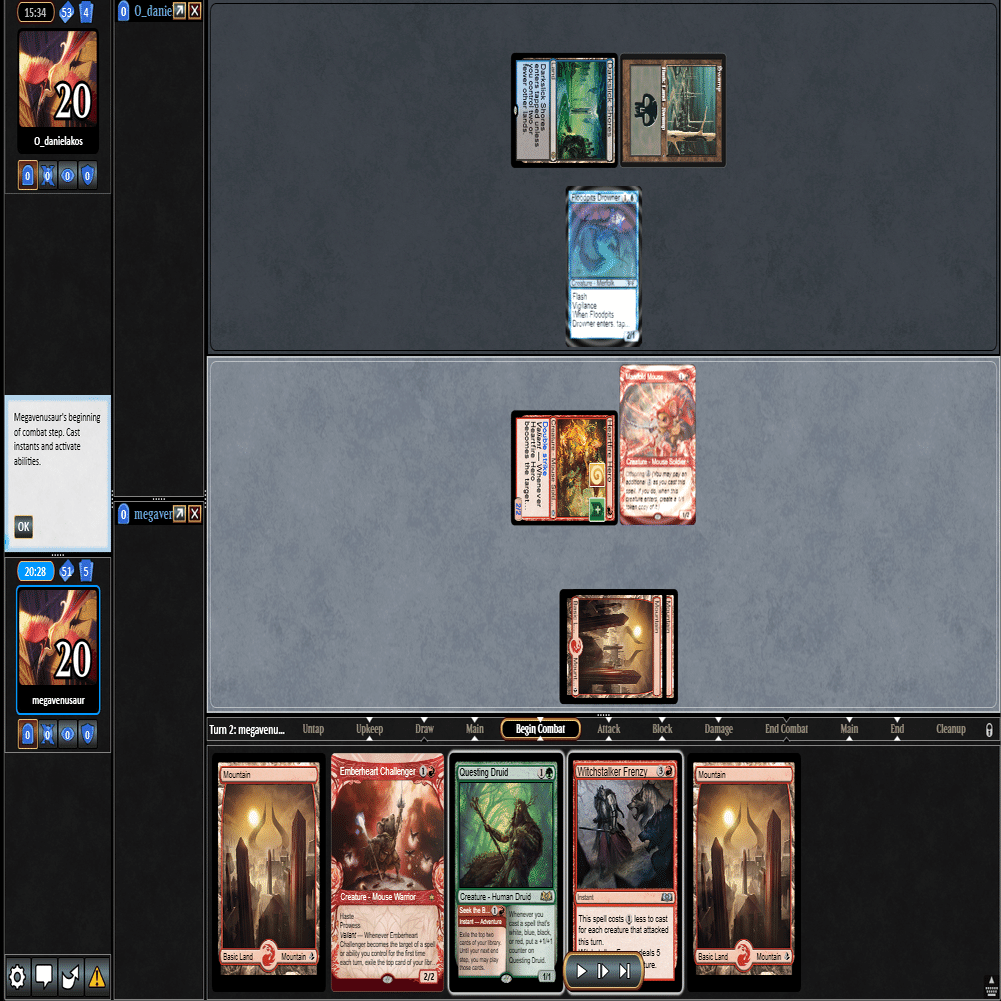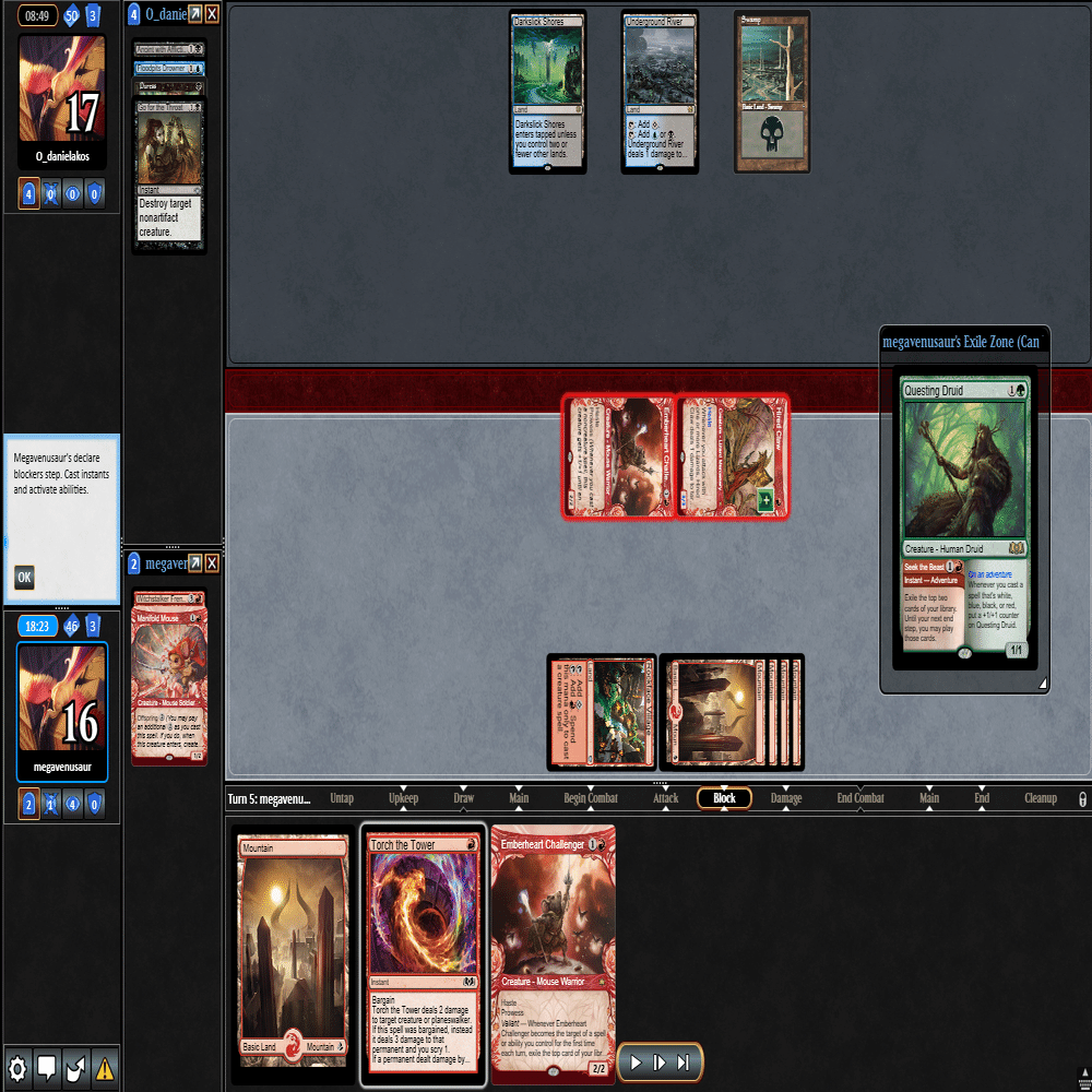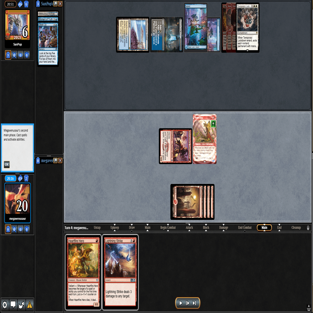 3ターン目に≪心火の英雄≫+≪多様な鼠≫の返しに≪鋼と油の夢≫で≪探索するドルイド≫を抜かれ、≪分派の説教者≫を出された場面。