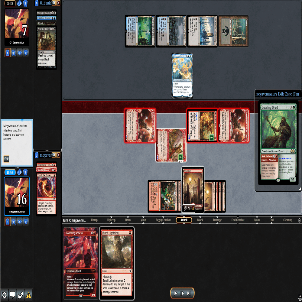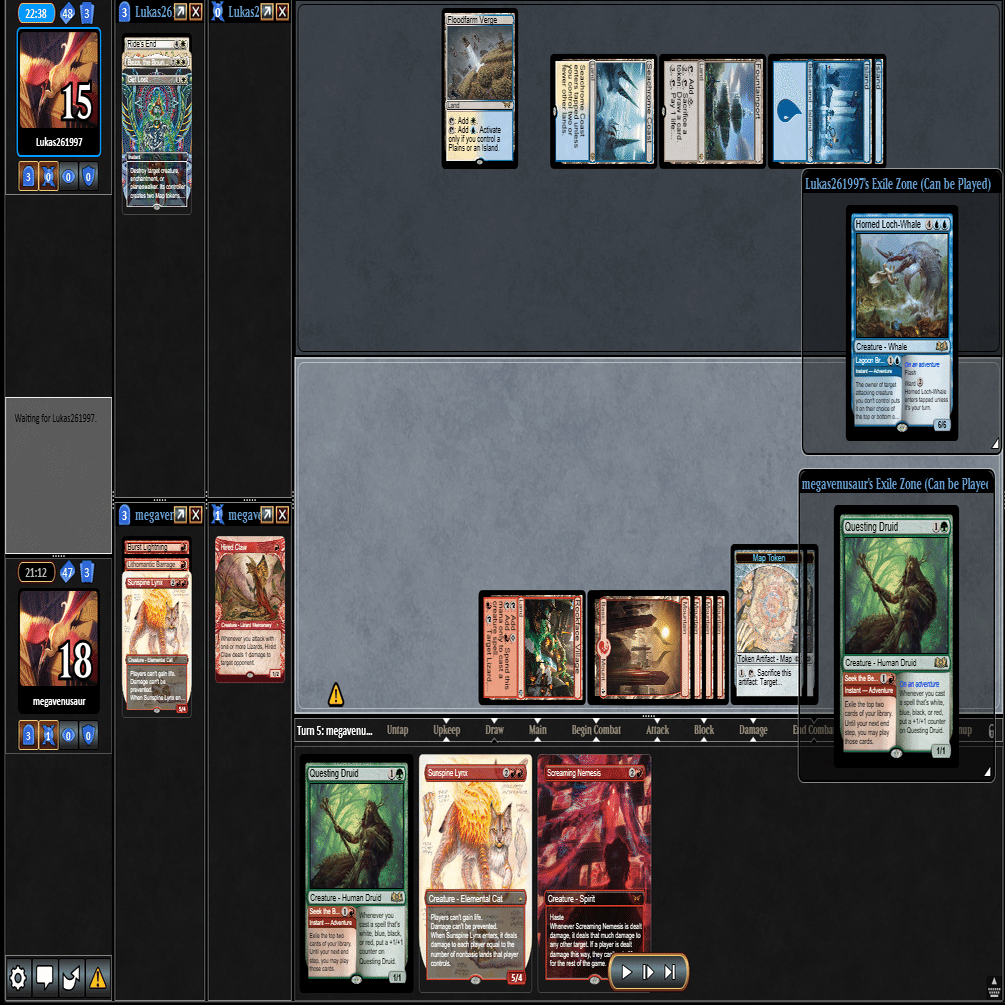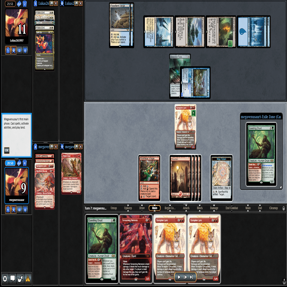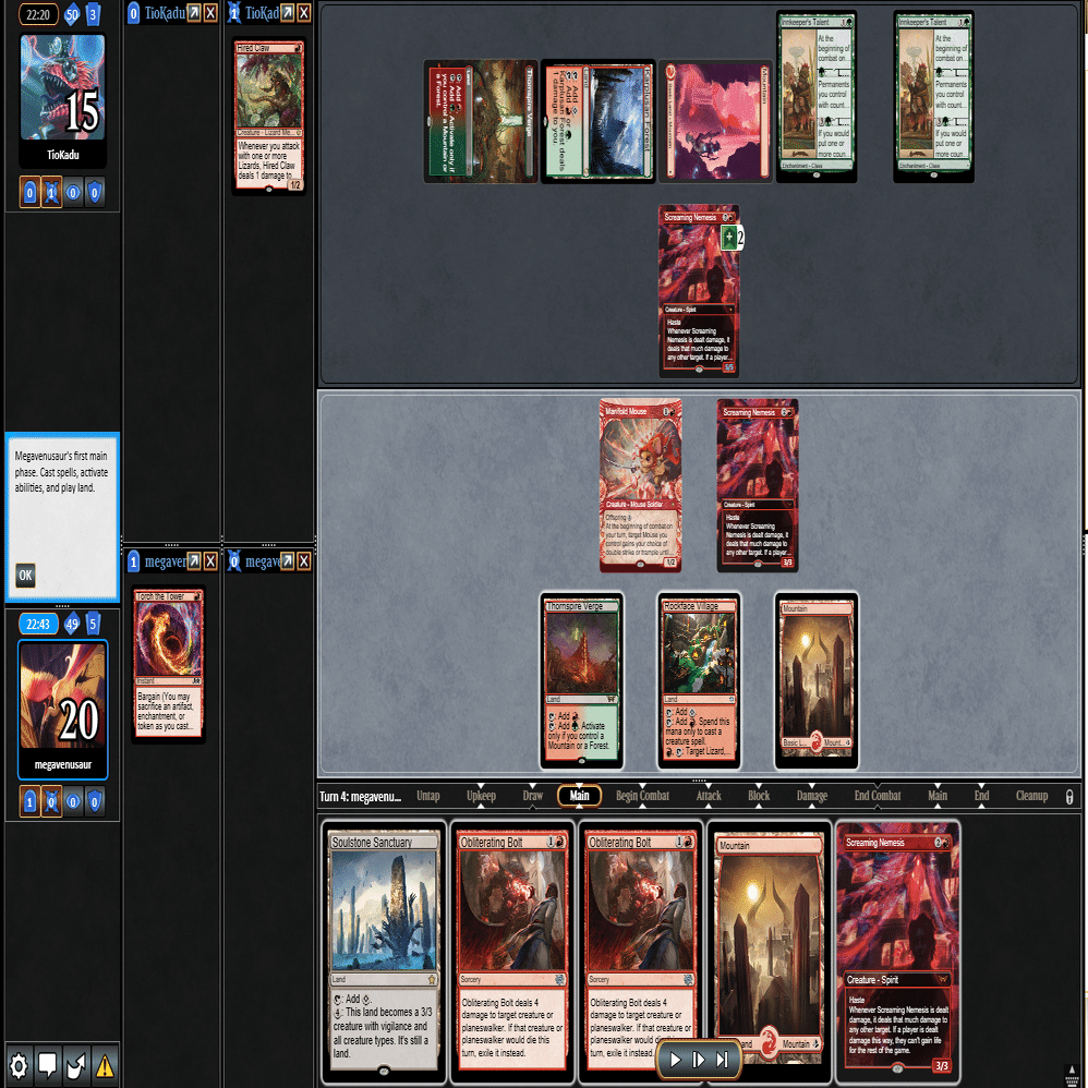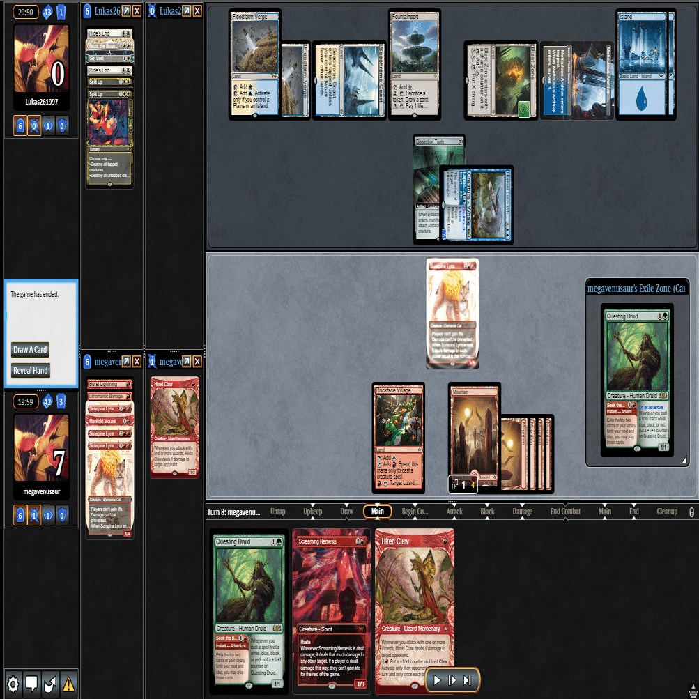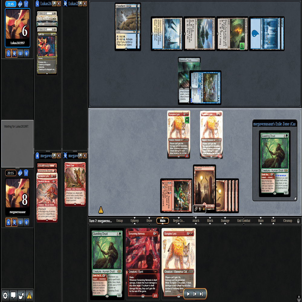 幸いなことに≪跳ねる春、ベーザ≫はプレイされず、≪ミストムーアの大主≫を出されただけだったのに加え、こちらのトップが≪叫ぶ宿敵≫と強力だったため、ダブルブロックされるも4点+ゲイン不可付与でライフを2まで削ることに成功。