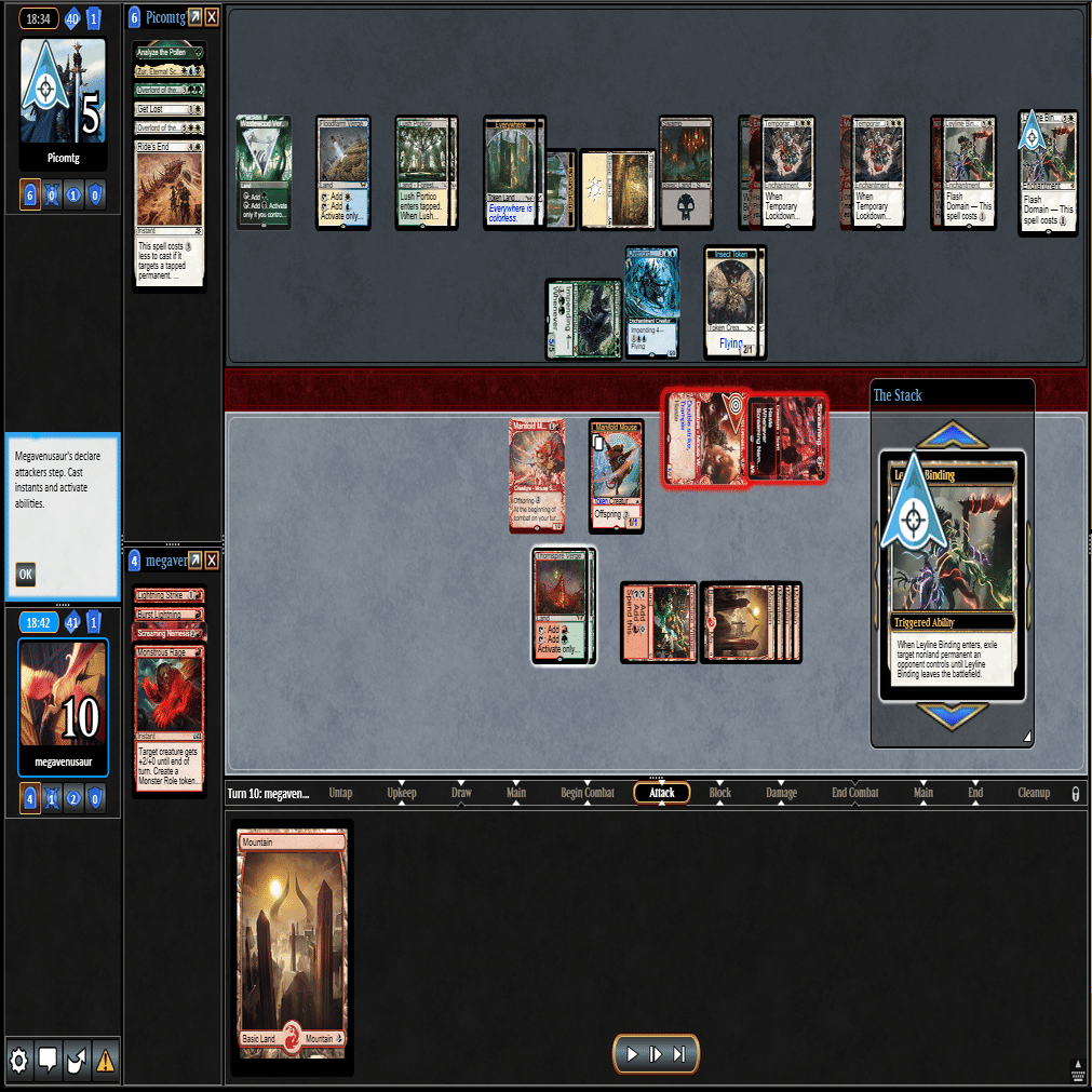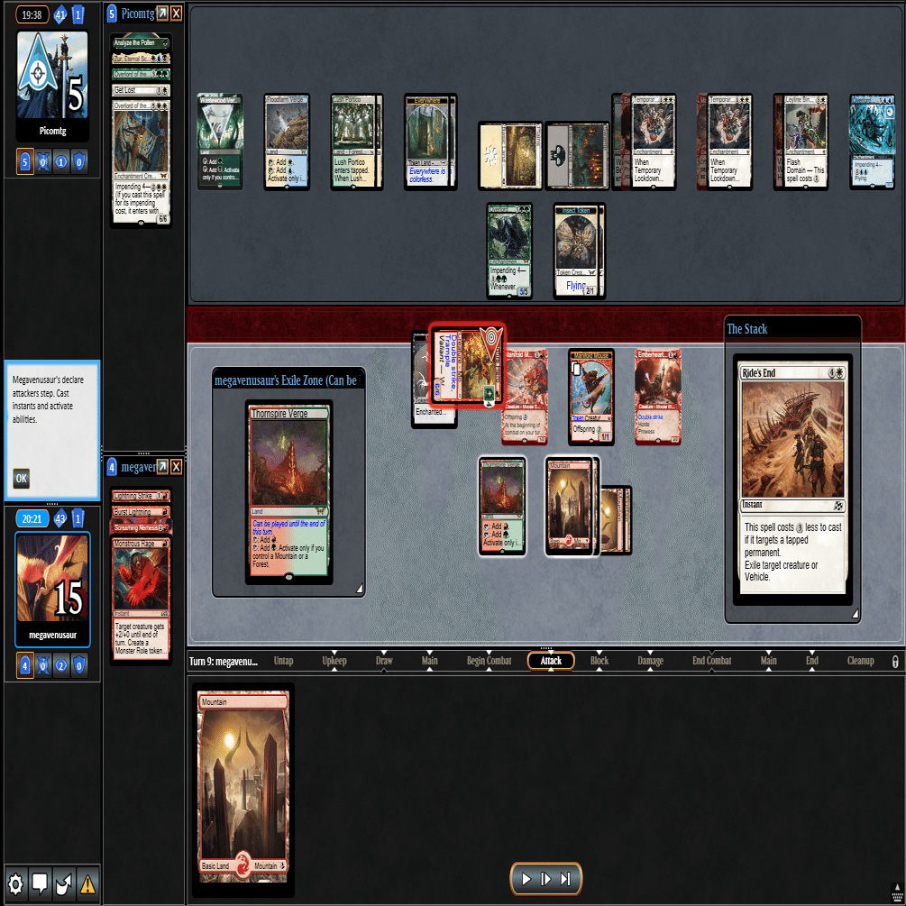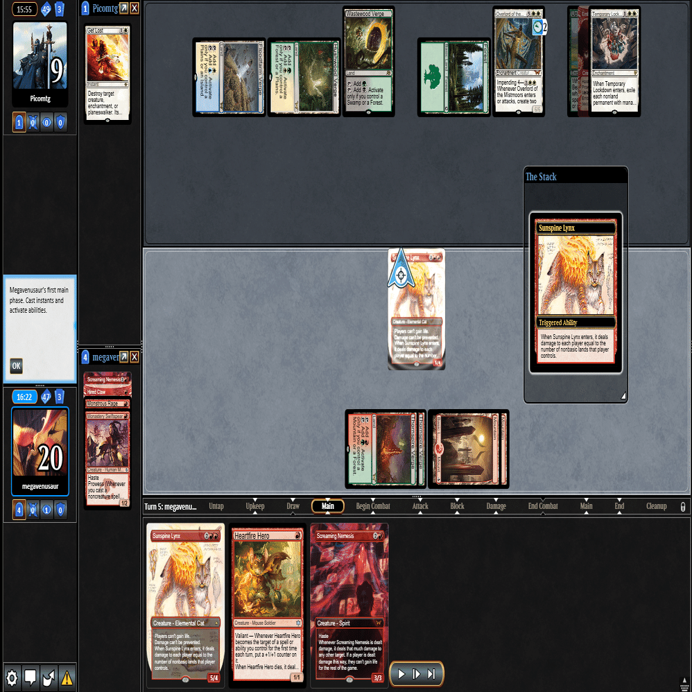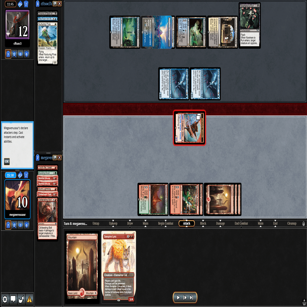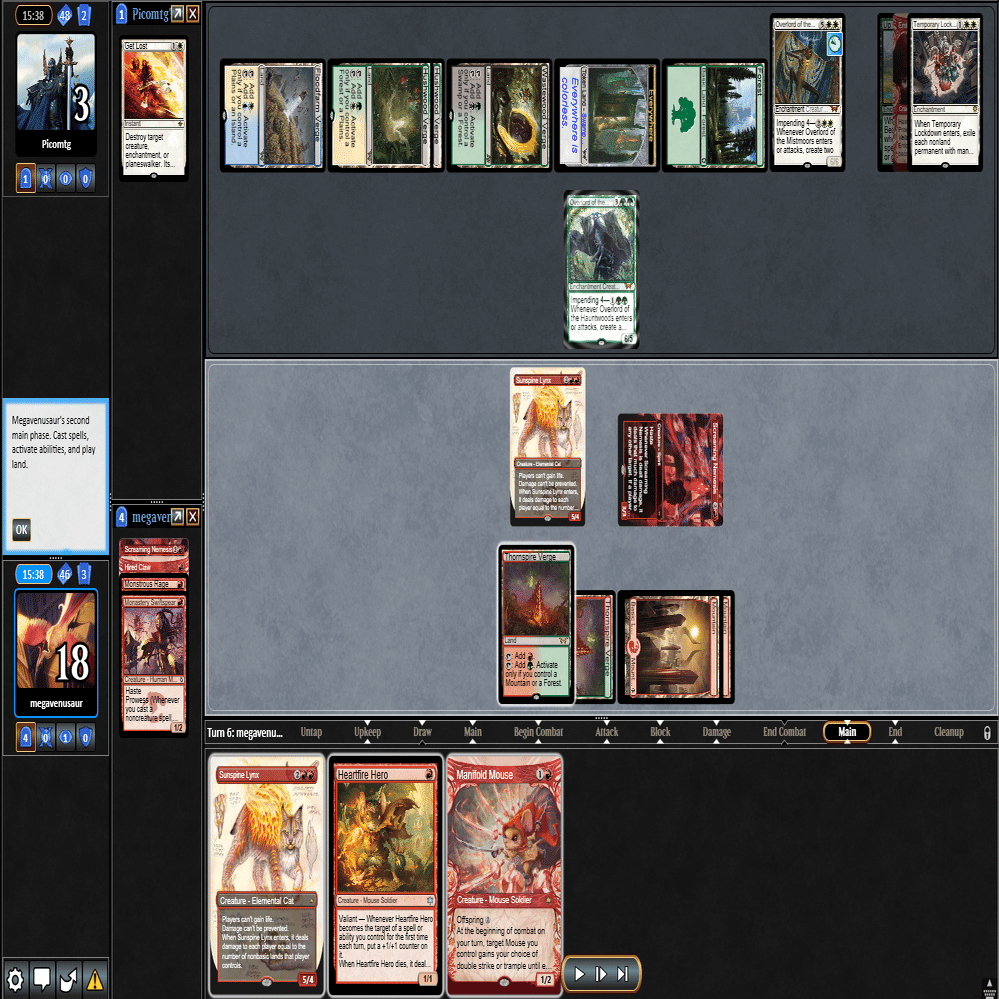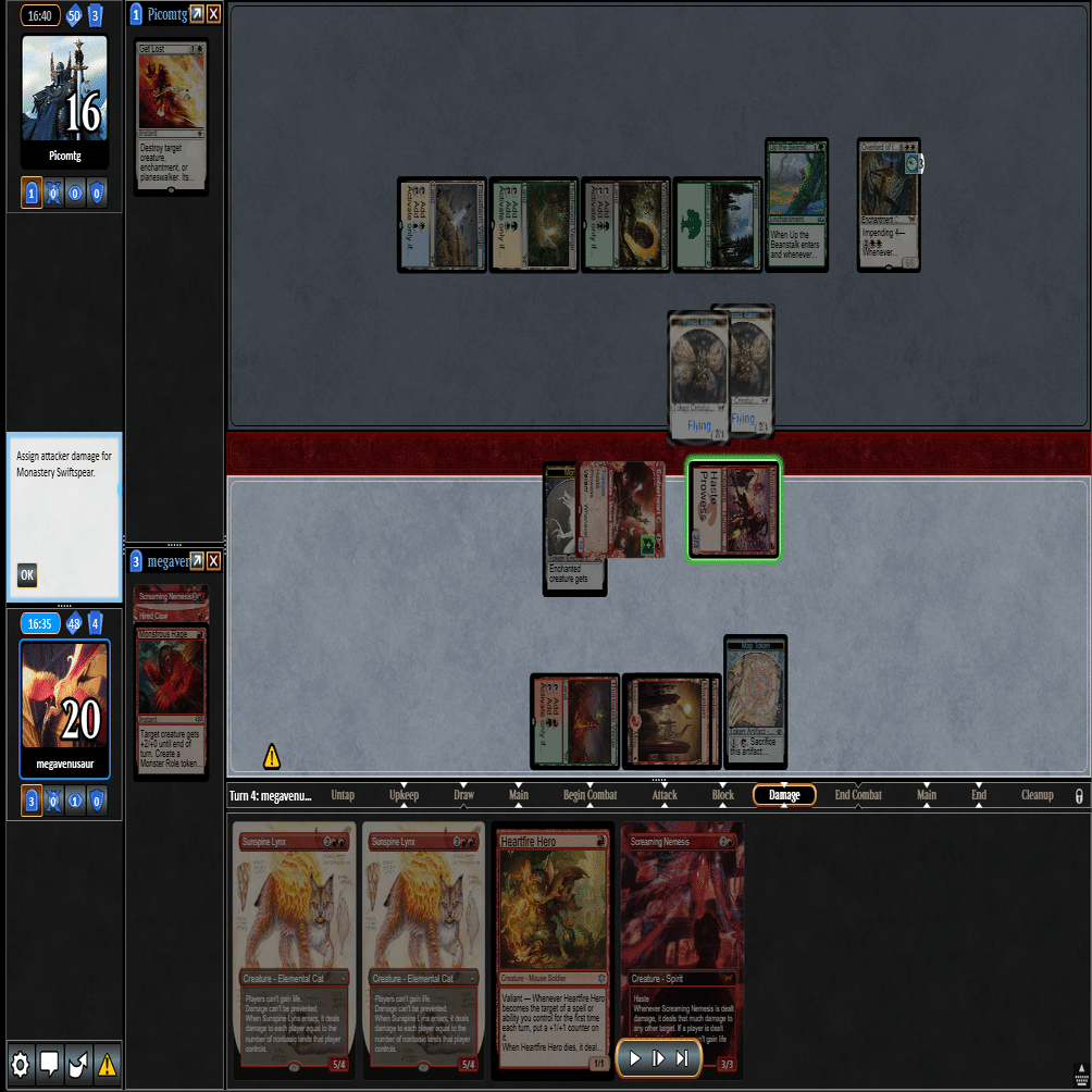 幸いなことに≪跳ねる春、ベーザ≫はプレイされず、≪ミストムーアの大主≫を出されただけだったのに加え、こちらのトップが≪叫ぶ宿敵≫と強力だったため、ダブルブロックされるも4点+ゲイン不可付与でライフを2まで削ることに成功。