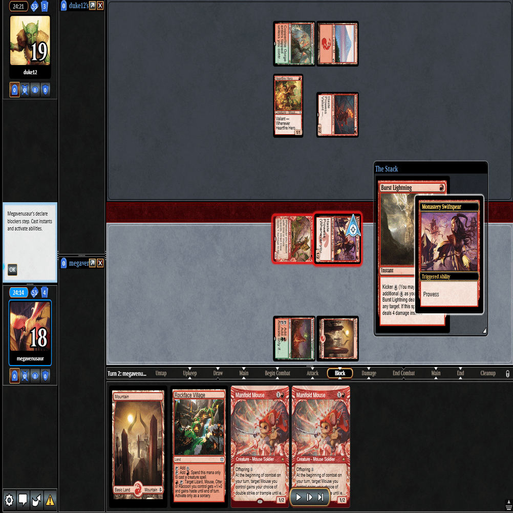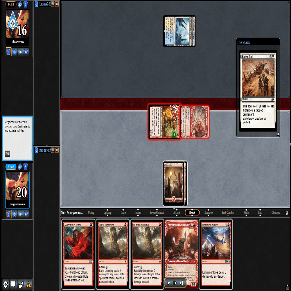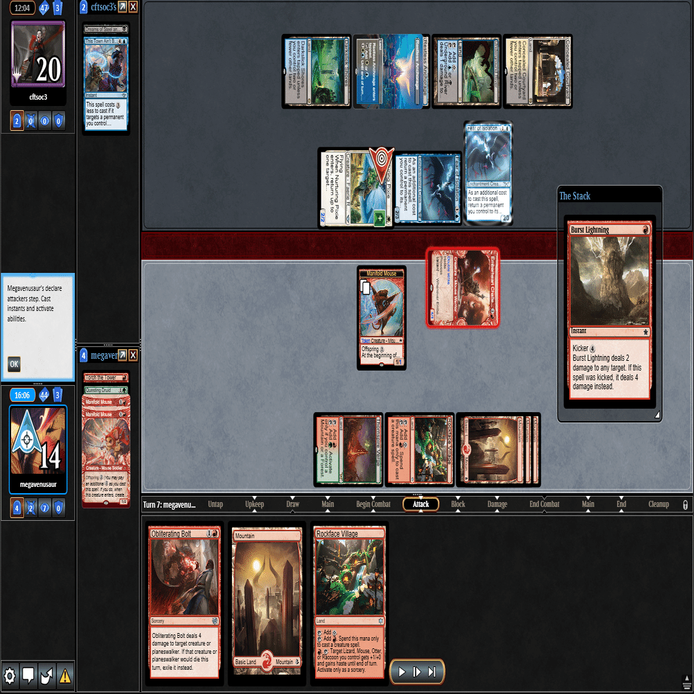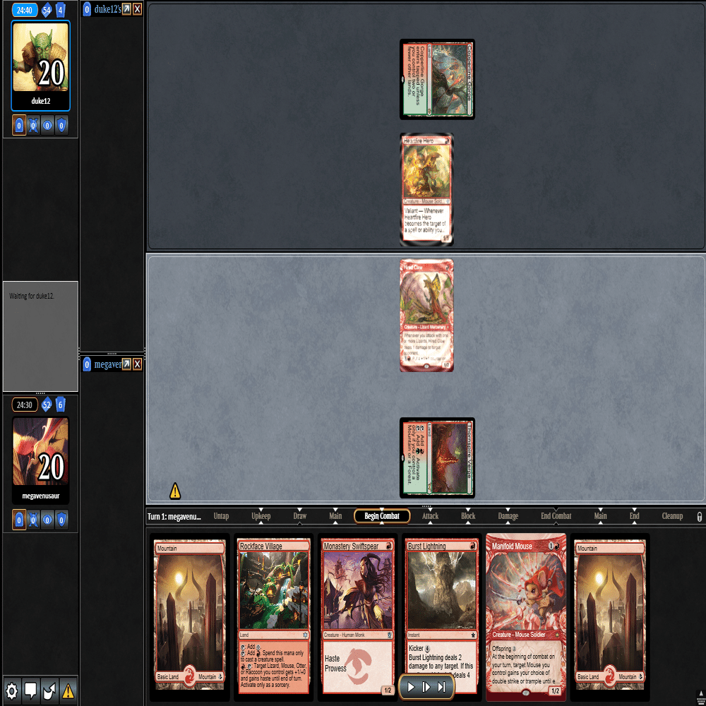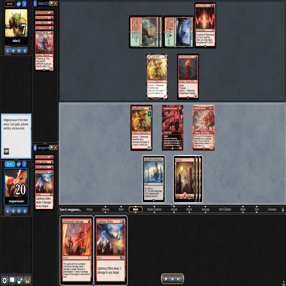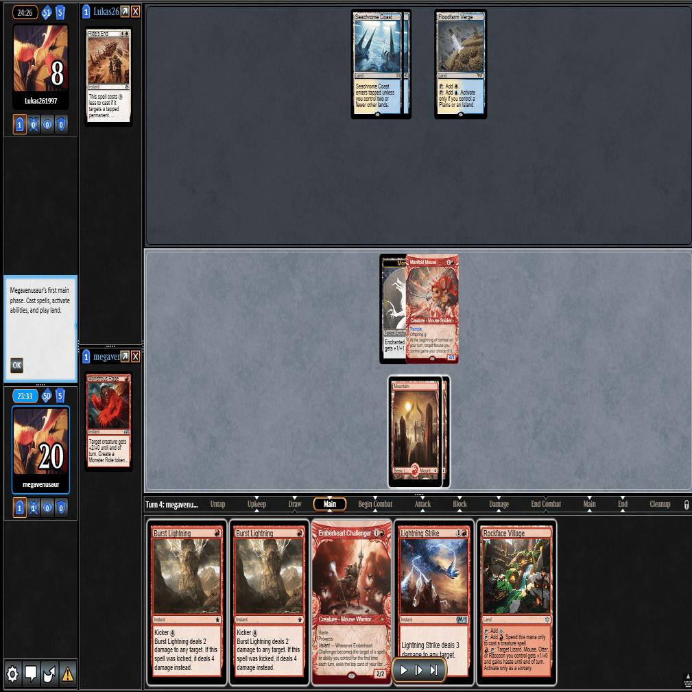 2ターン目に出てきた≪多様な鼠≫をトップしてきた≪稲妻の一撃≫で除去して3ターン目。相手が土地2枚で止まっておりこちらは全く余分な土地を引かなかったため、このまま勝利。