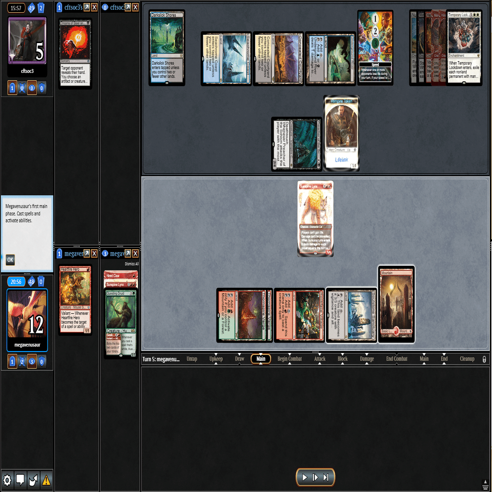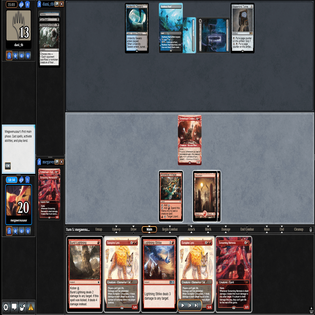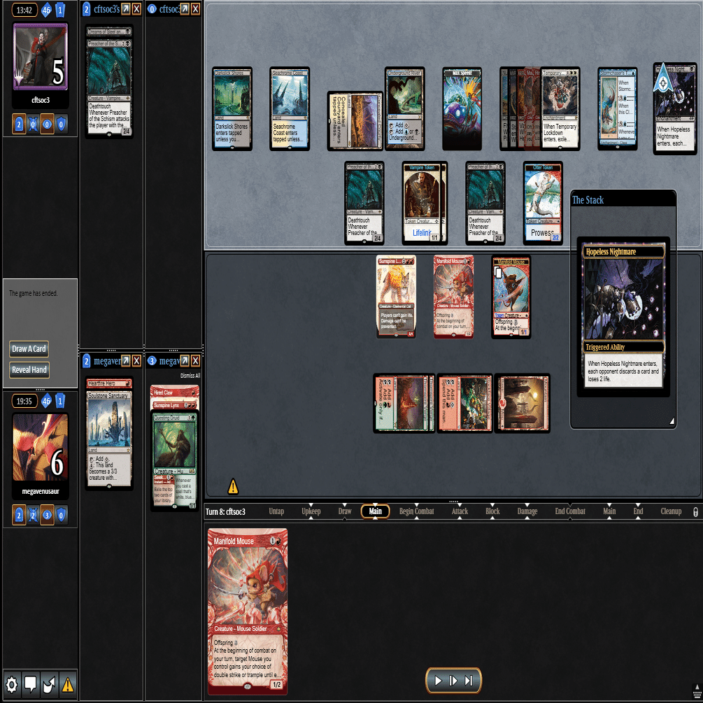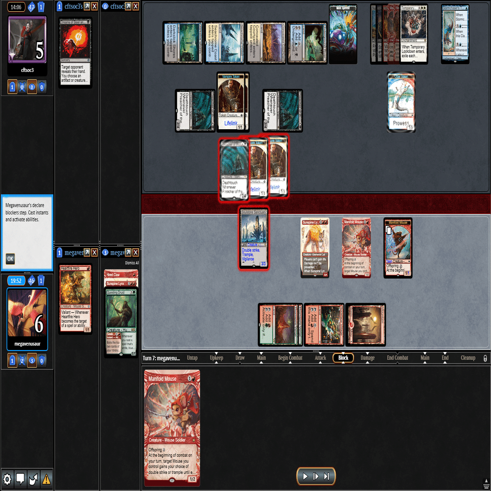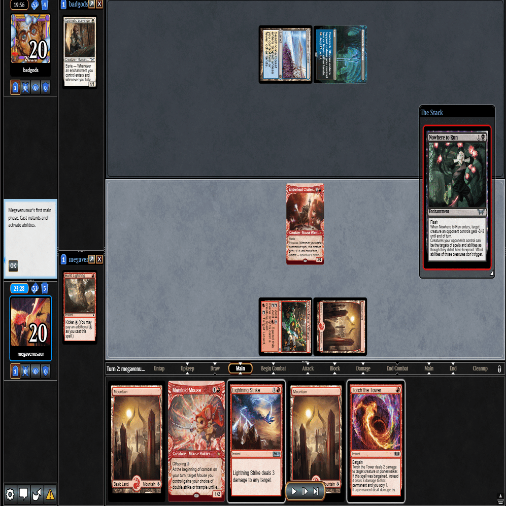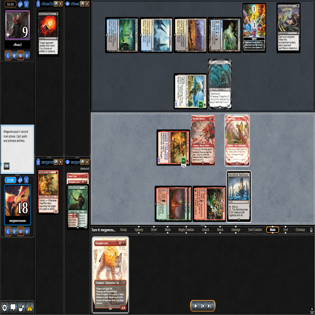 ≪逃げ場なし≫で≪熾火心の挑戦者≫を除去+≪分派の説教者≫で返された場面。