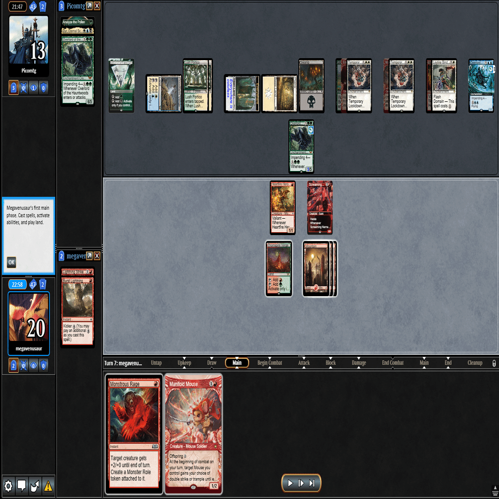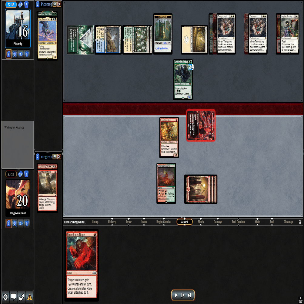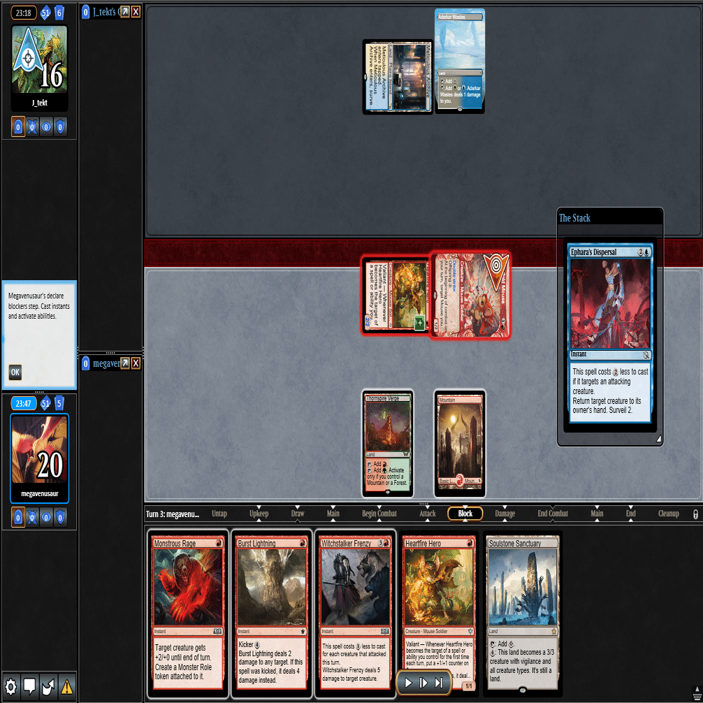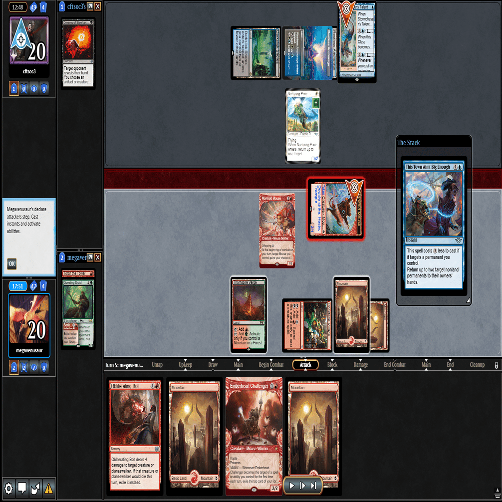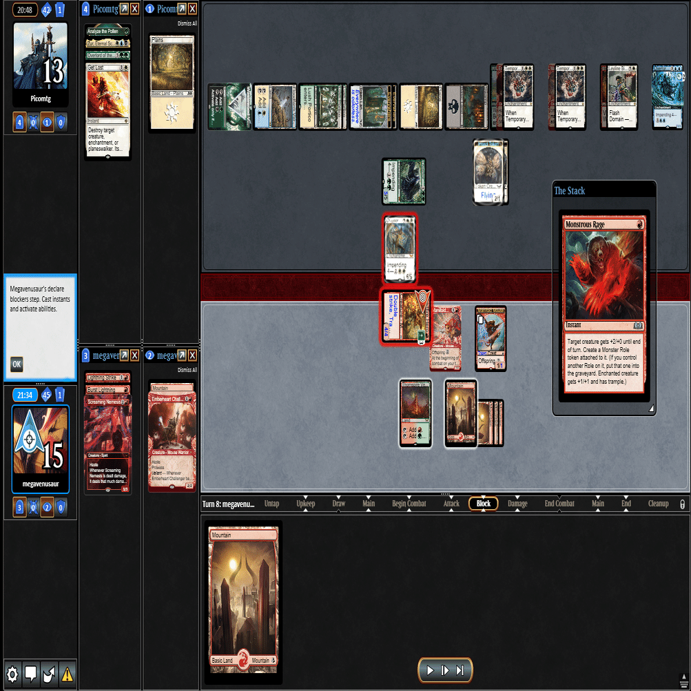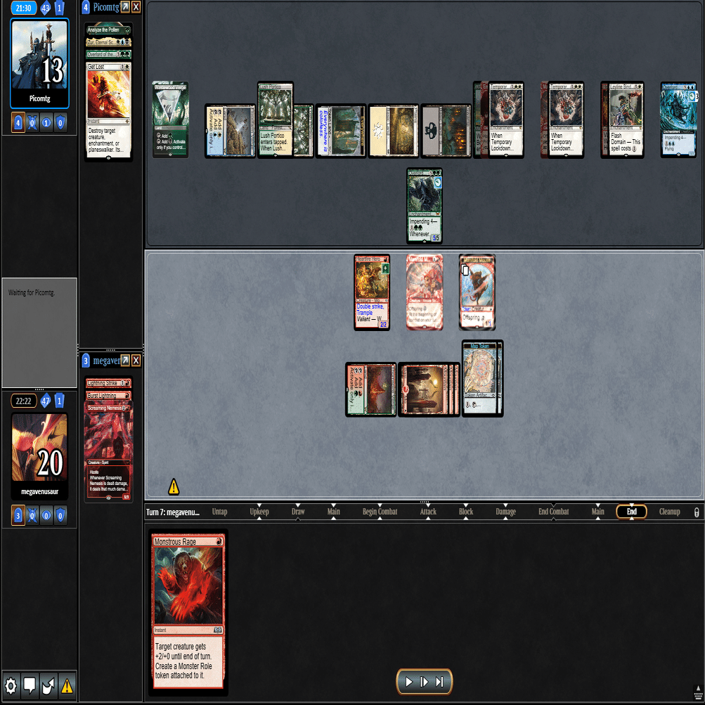 ≪叫ぶ宿敵≫をプレイして≪逃げ場なし≫や≪この町は狭すぎる≫されるとテンポを取り返されてしまうため、トップした≪巨怪な怒り≫と合わせて1マナスペルでトリプルアクション。