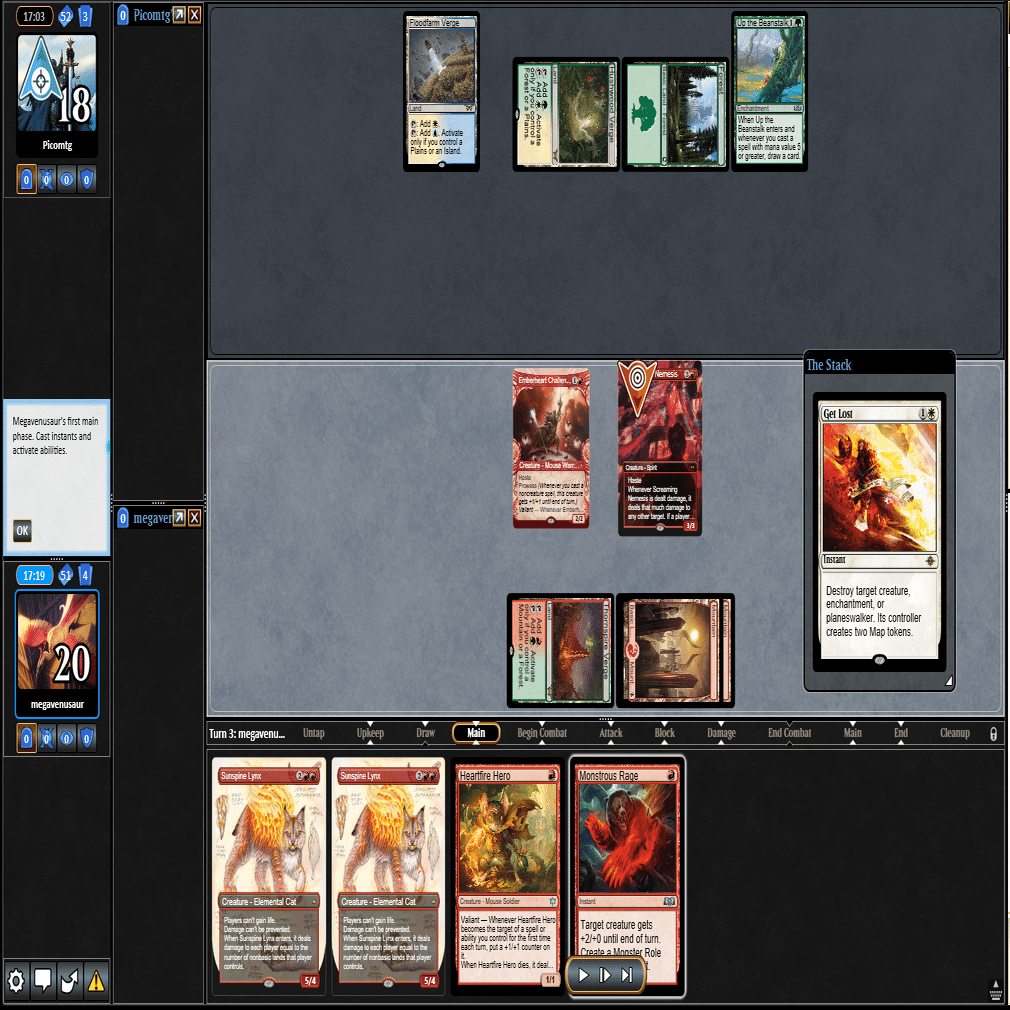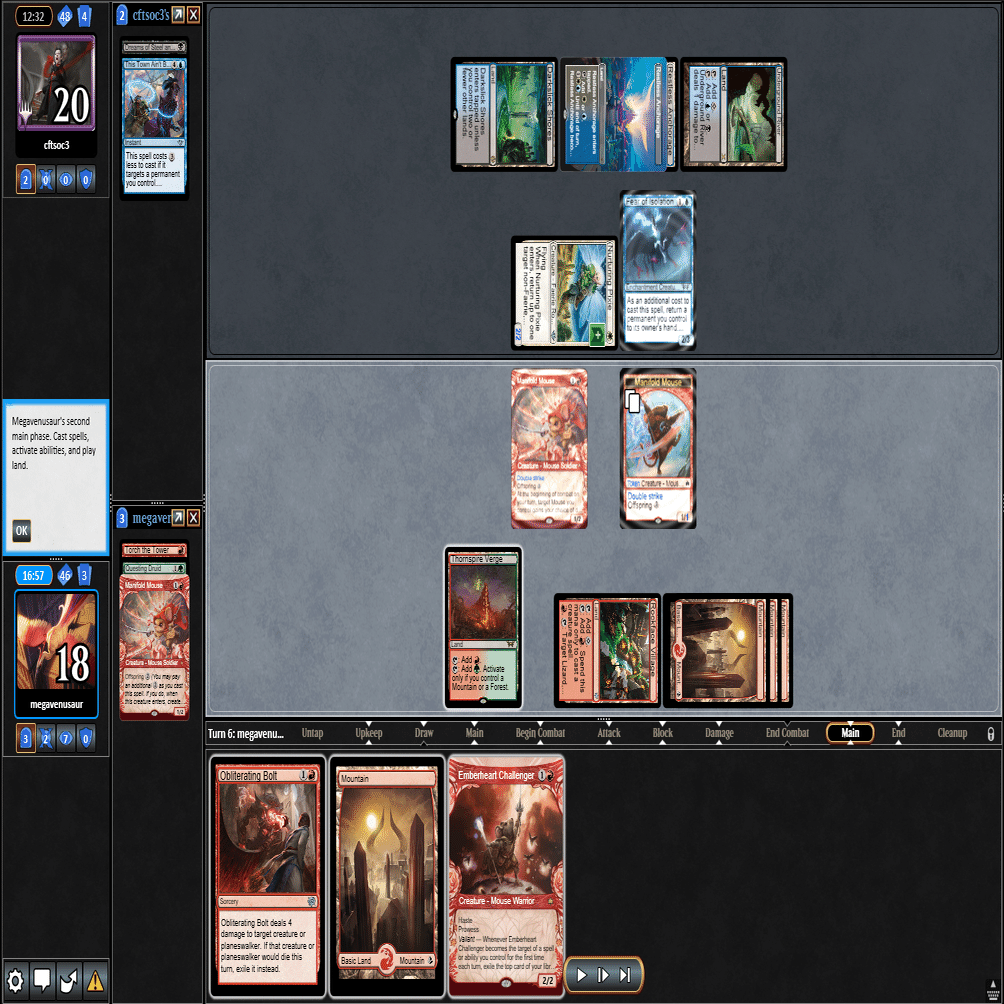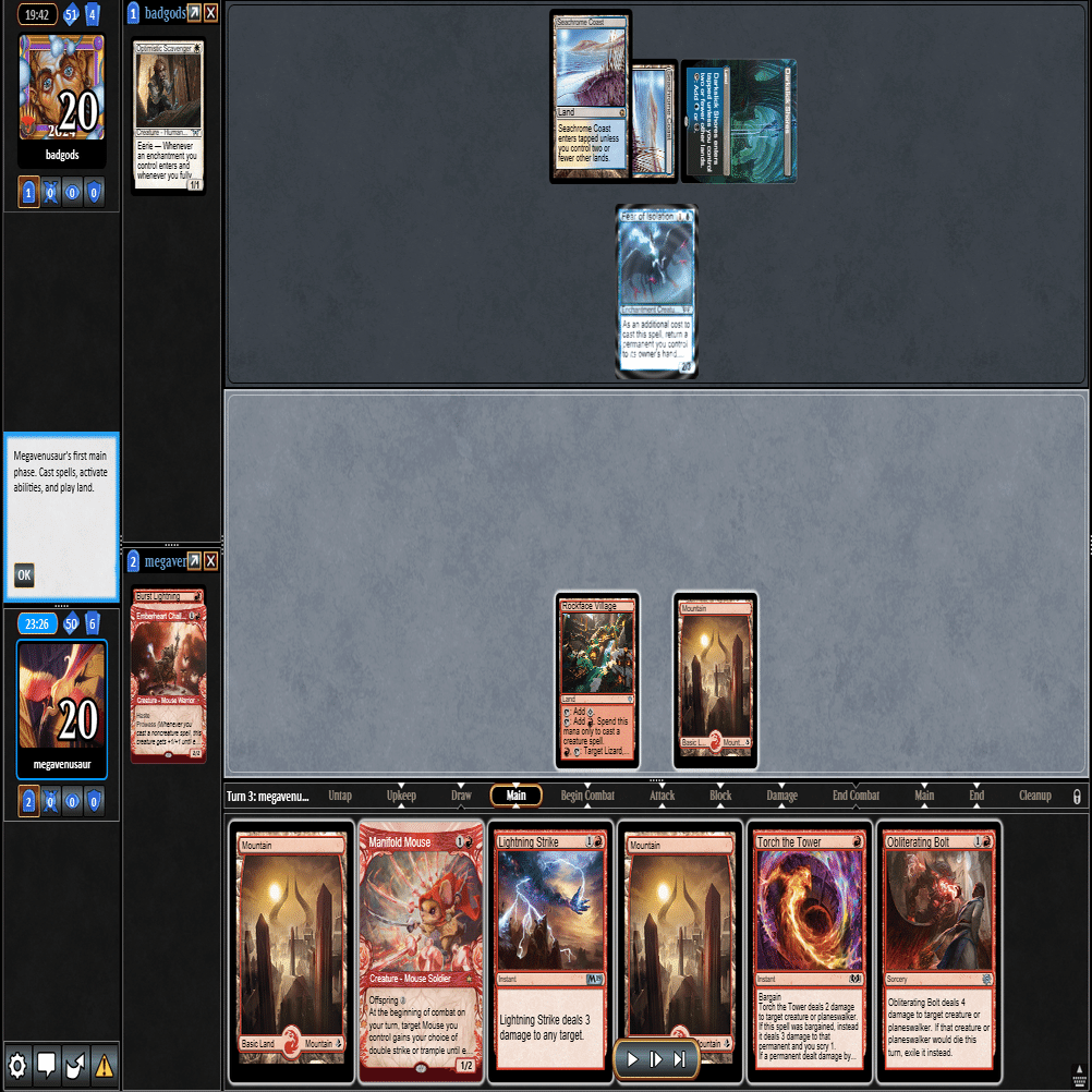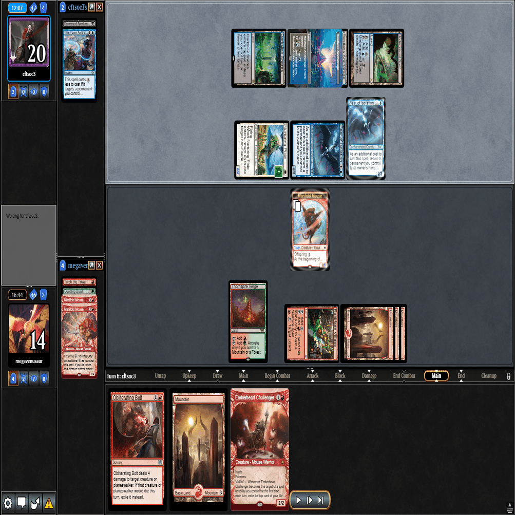 3ターン目は≪ドルイド≫本体をプレイ+≪塔の点火≫でカワウソトークンを除去した返しに、≪逃げ場なし≫で≪ドルイド≫を除去される。