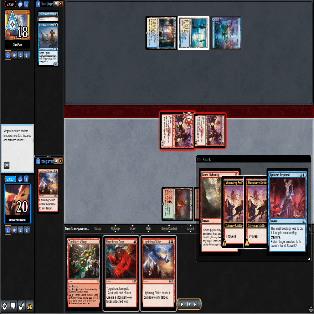 ≪熾火心の挑戦者≫に≪岩面村≫を起動すると≪噴出の稲妻≫がめくれたので、≪ピクシー≫を除去しつつ二段攻撃付与で8点を与えます。