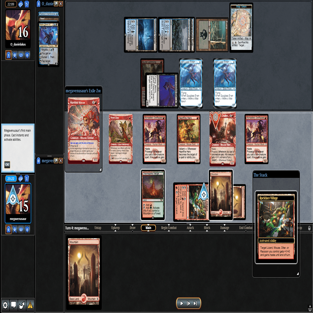 このターンは≪岩面村≫を≪心火の英雄≫に起動しで≪多様な鼠≫で二段攻撃付与して8点+≪雇われ爪≫を展開します。