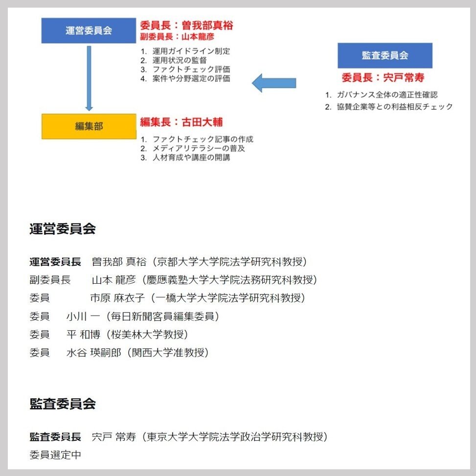 本来であれば、監査委員会はJFCの活動開始からすぐに立ち上げるか、あるいは3カ月、半年ぐらいで立ち上げなければならないのに、早くやらないから批判を受ける。それでも、JFCのファクトチェックについては、監査委員会とは別組織になりますが、運営委員会で判断しているので、監査委員会の立ち上げは遅いですが、ギリギリ許容範囲だろうと思っています。