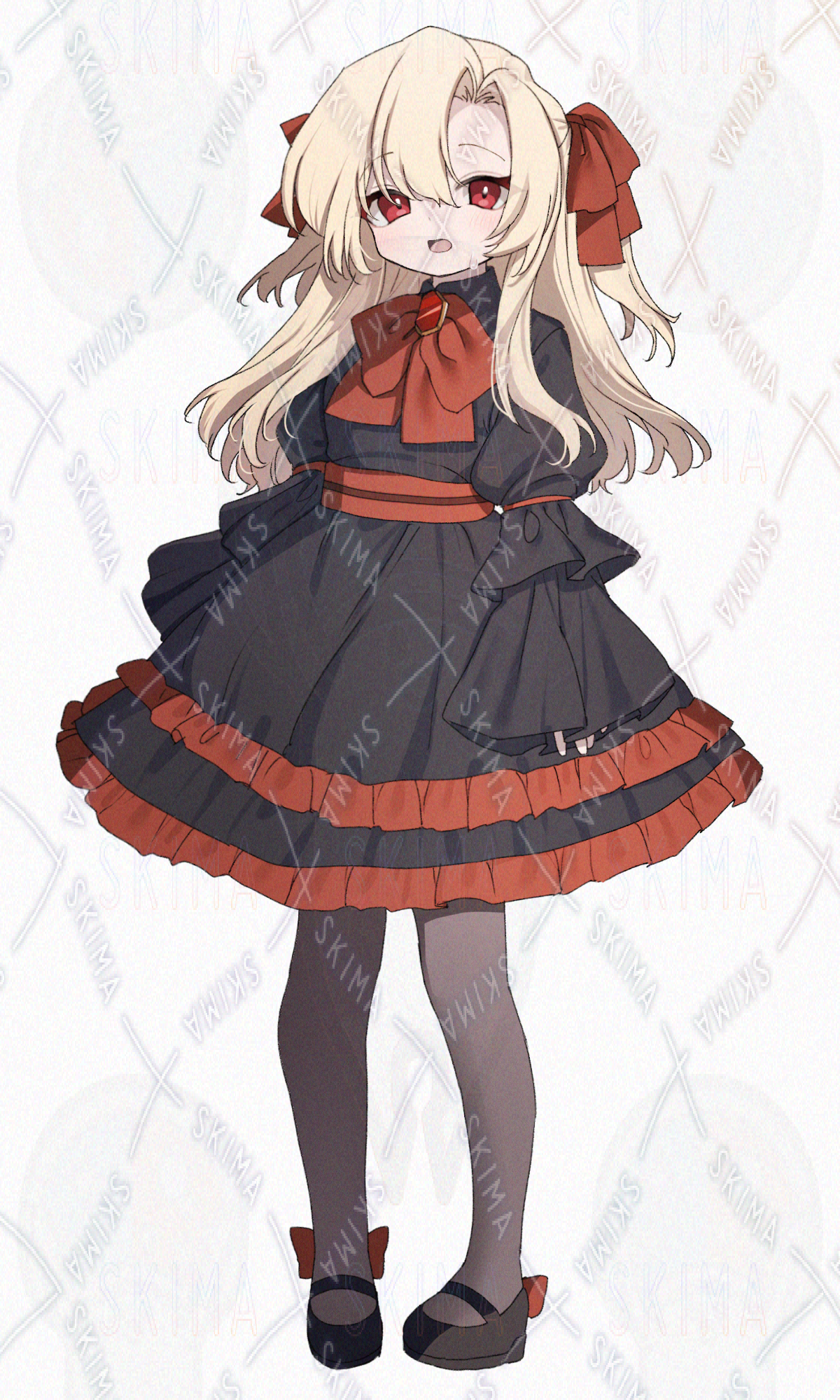 金髪ハーフツインテール、赤と黒なフリフリワンピースの女の子です。キャラ設定はご自由に。