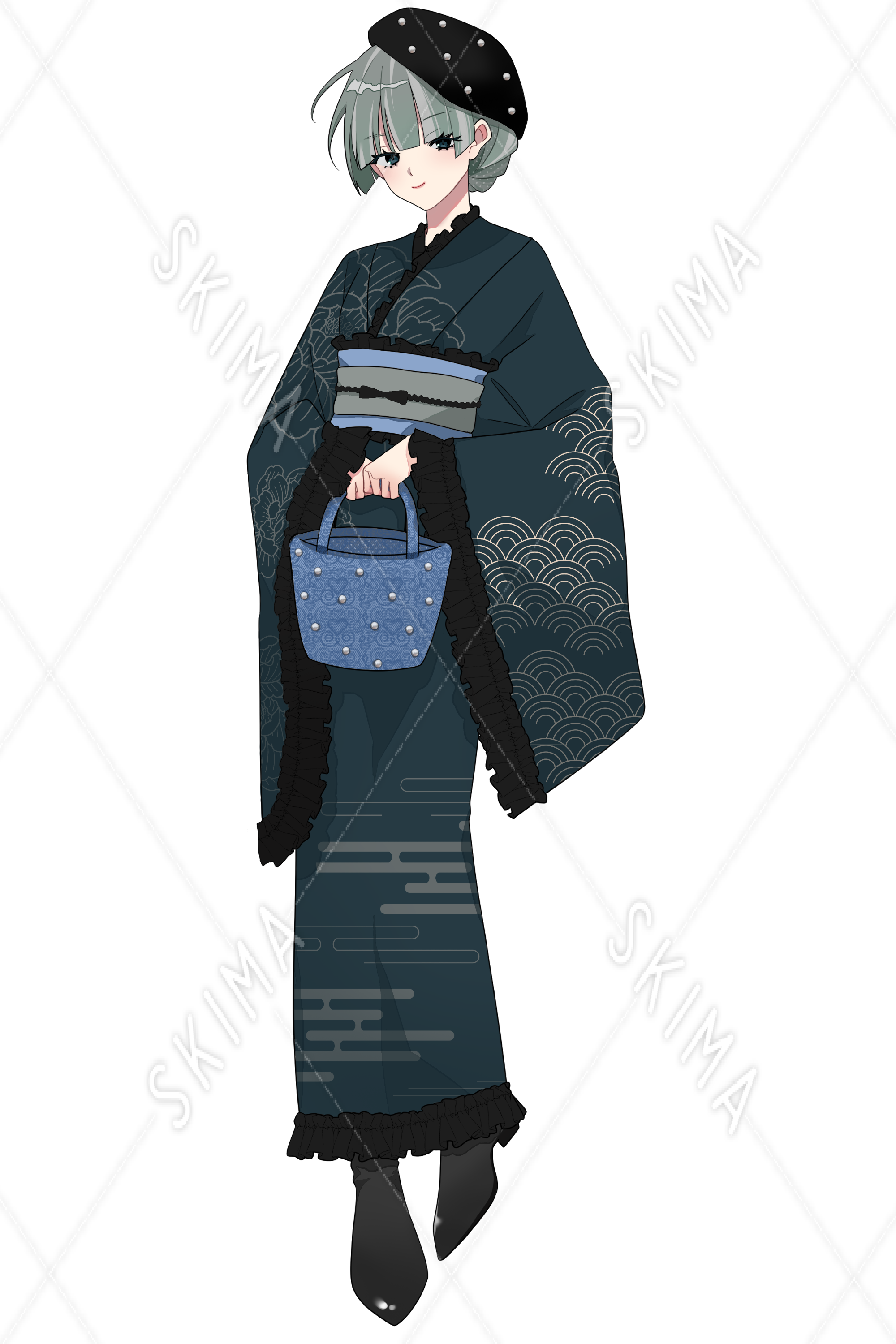 フリルをたくさんあしらったレトロモダンな着物を着た少女の立ち絵です。