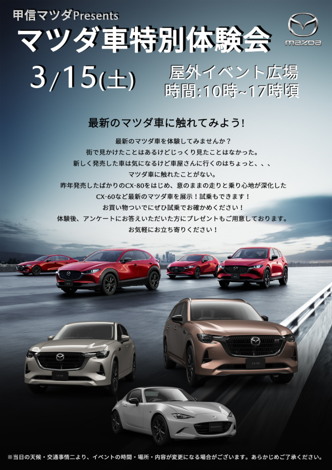 昨年発売したばかりのCX-80をはじめ、意のままの走りと乗り心地が進化したCX-60など最新のマツダ車を展示!試乗もできます!