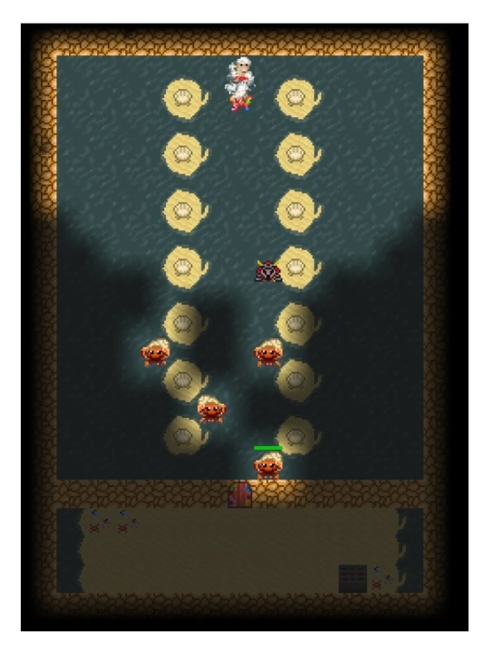 It should be noted that all medium to high level flying pets do perfectly on this depth, as all have ranged attacks that recharge quickly to their level (especially those with ranged lightning attacks do better than all, as they deal more damage because of the water) and are completely safe, as Albino Piranhas never notice them, even when the pets attack them (the player can just tap the clock button and watch the pet slaughter carefree piranhas), but all walking pets apart from a medium level and above Bunny do awfully on this depth, as they wander stepping on water and the Albino Piranhas gather around them and attack them en masse. Apparently a weak flying pet like the Bee will also do awfully on this depth as far as killing Albino Pirahas is concerned, but at least it will be safe from the Albino Piranhas' attacks. For similar reasons a Huntress with a highly upgraded Ring of Sharpshooting can kill safely most of the piranhas by throwing her boomerang at them from dry land (without this ring she will mostly miss them due to their high evasion) and also Mages with highly upgraded battle wands.
