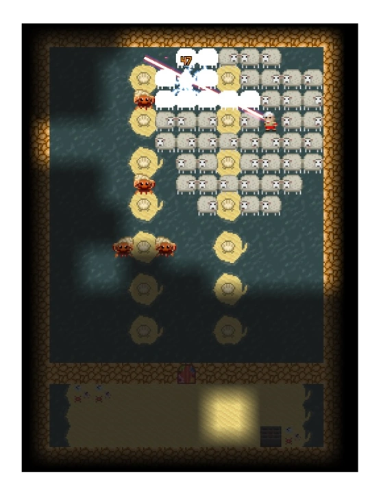 The hero will always spawn in the center of the map. If the center of the map will have water tiles, he/she will get attacked immediately by all the nearby Albino Giant Piranhas during game night as all the other piranhas will be still sleeping, and by all the depth's Albino Giant Piranhas during game day as they will all be awoken, and also by Flying Protectors. In this case, he/she should better splash him/herself with the dew vial, to become invisible for the Albino Piranhas and move quickly to dry land, and also drink a potion of Levitation if the Protectors start zapping him/her with lightning bolts, as the damage of lightnings is doubled for all characters stepping on water and the Protectors of this specific depth are immune to invisibility, so they will be still able to aim at him/her with their lightnings. If he/she spawns on dry land, he/she will be lucky, as neiher the Protectors active on the depth or the prianhas will notice him/her at all. Inside a nearby chest a potion of Levitation and 99 Dumpling Bombs will be contained, which will be extremely useful for the hero if he/she had arrived during game night to teleport the sleeping Albino Piranhas to dry land, where they will automatically die. Unfortunately once all the sleeping Albino Piranhas are killed, the newly spawned will be awoken, and they will be almost impossible to target with the bombs, unless the player guesses correctly their location in two turns' time, as they will wander around quickly and randomly in various parts of the depth, but whenever the hero steps on water, he/she will immediately attract almost all the Albino Piranhas and the Protectors of the depth. Heroes with a good amount of HP and a highly upgraded armor can also either: a) lure piranhas by using themseleves as bait, stepping inside the water, waiting for two or more piranhas to gather around them, throwing the dumpling bomb, watch the piranhas vanish, repeat or b) use a Wand of Telekinesis if available to push piranhas to a dry land tile (no matter how much upgraded this wand is, it pushes enemies only for a distance of one tile). Piranhas also respawn rather slowly, so players can read this guide about the hero spending their time constructively while waiting for them to spawn.