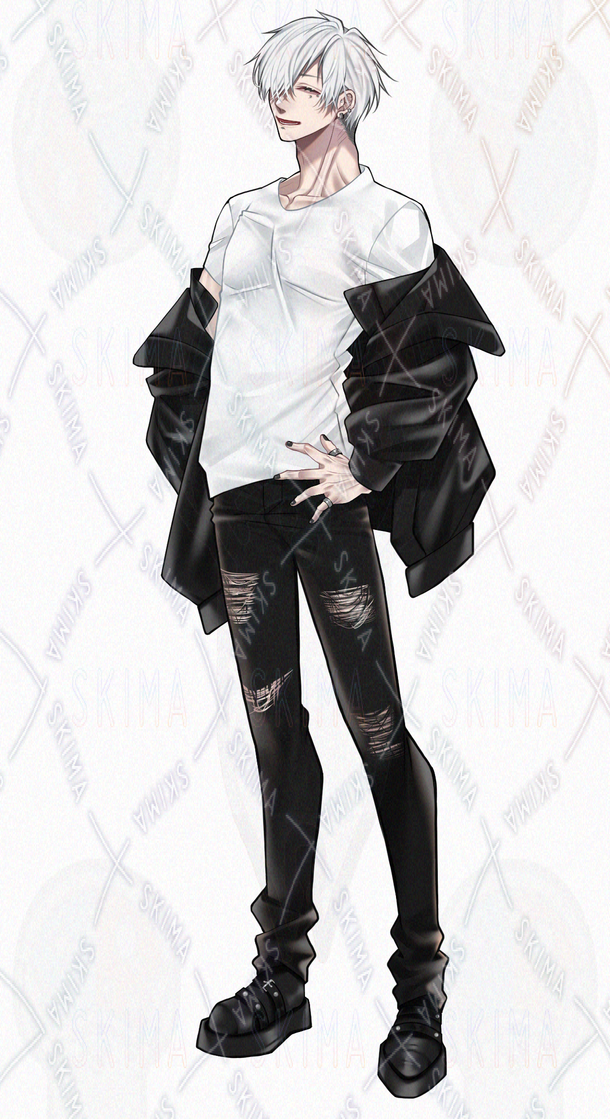 男性/男の子/男性キャラクター/立ち絵/TRPG/全身/短髪/白髪/片目隠れ/銀髪/筋肉質/タクティカル風/ボディピアス/黒ネイル/ジャンパー/顔面ピアス/モノトーン/お兄さん