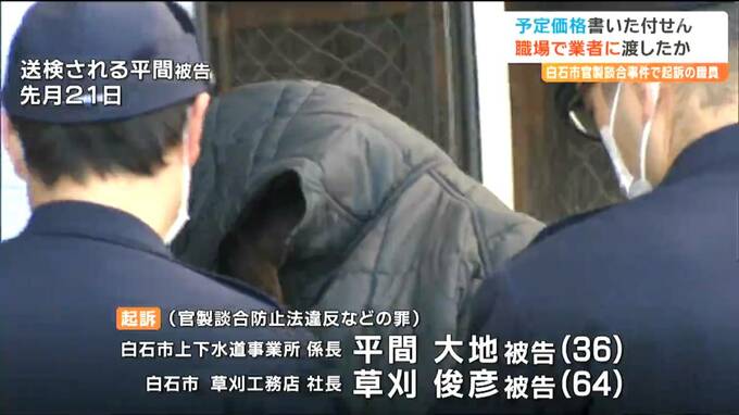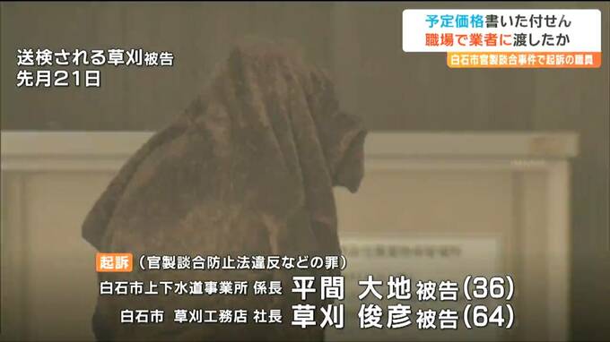 起訴状などによりますと、2023年9月に白石市が発注した配水施設の防水工事の指名競争入札をめぐり、平間被告が、工事の「予定価格」と入札に参加する「指名業者」を草刈被告に伝え、公正な入札を妨害したなどとされています。