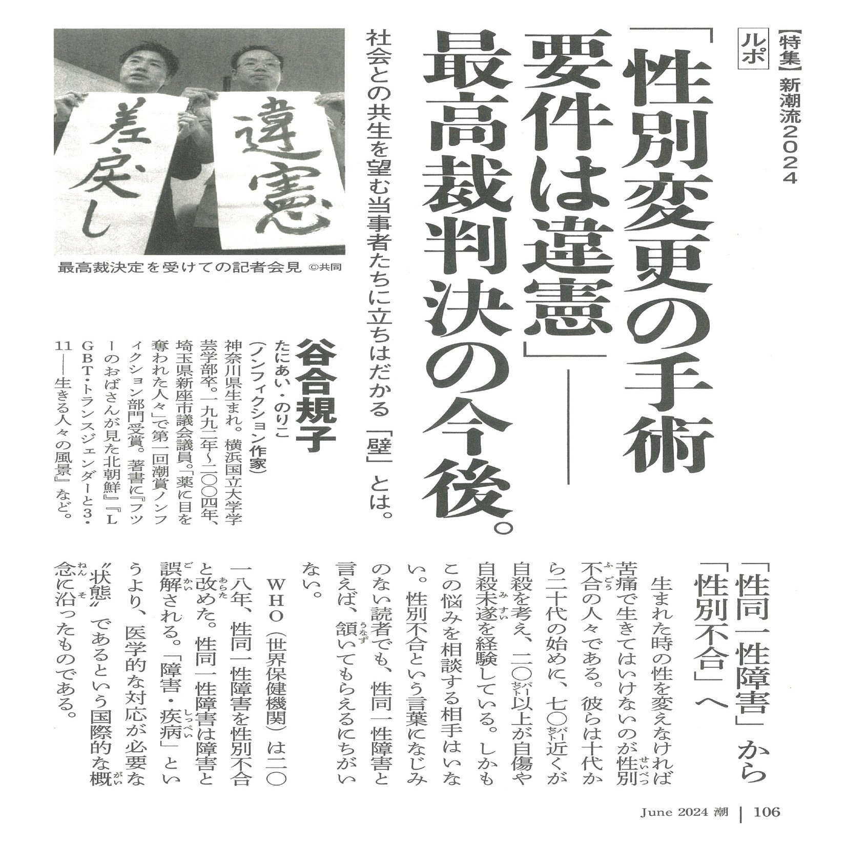 これは、WHO定義の人権モデル「性別不合」の視点から書かれた、潮出版社発行月刊誌の記事である。障害と誤解されるという言葉から偏見が滲み出る。医療は必要だが疾病ではないとしたところで違和は消えない。概念は患者を救わない。