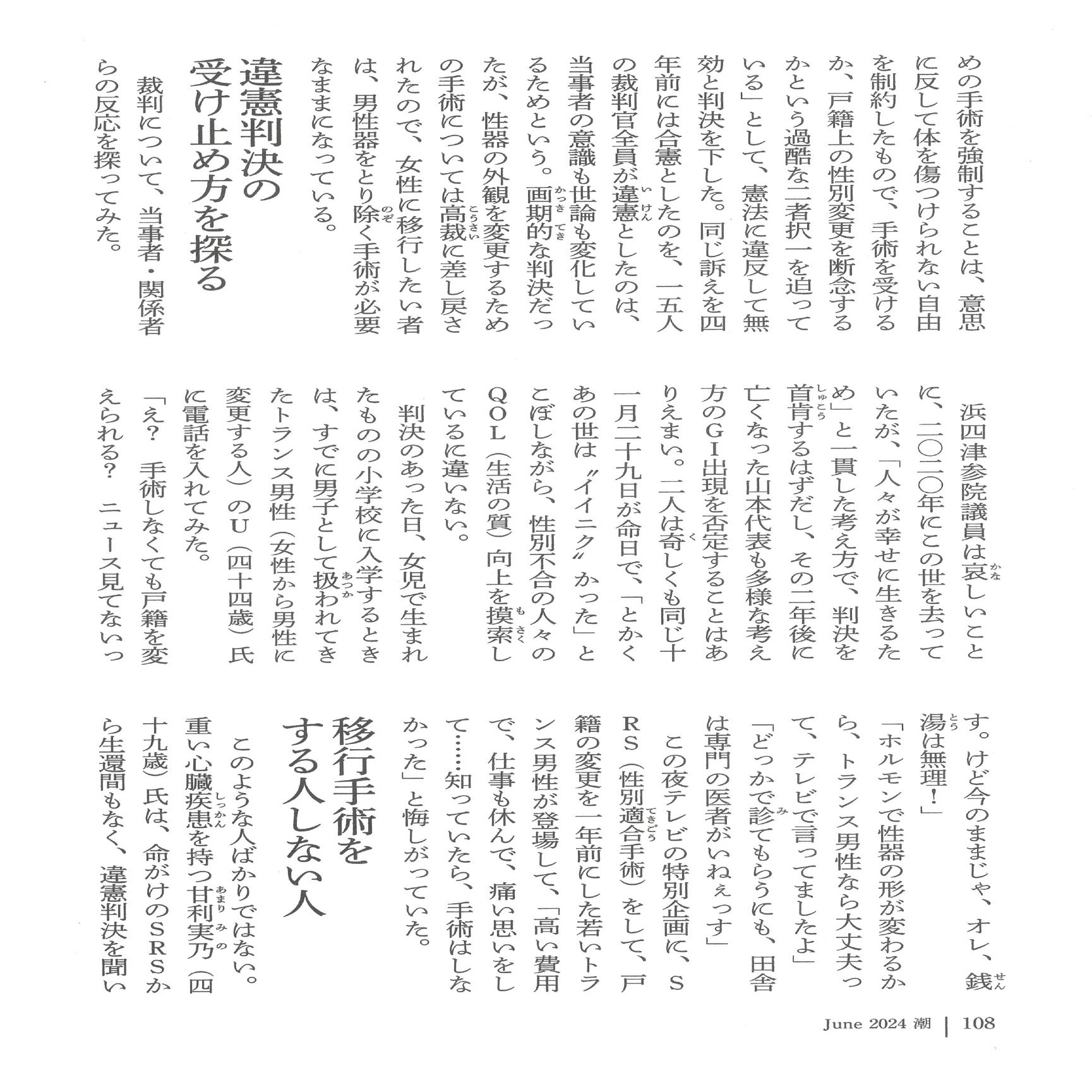 性同一性障害患者にとって手術を受けることは甘受ではない。過酷な二者択一を迫るものではない。苛烈な身体違和を緩和する現状唯一の治療方法だ。過酷な二者択一だと感じるのであれば、法で定義される性同一性障害対象者ではない。それだけだ。