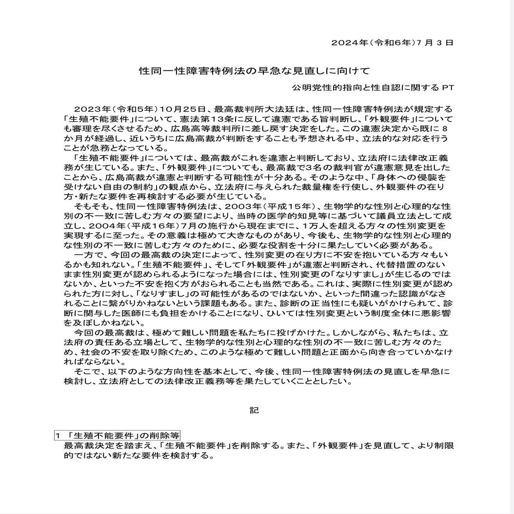 これ、私自身も立法府に身を置く者として、大変重大、重い責任をいただいたという風に重く受け止めております。そこで、公明党といたしましてもこの最高裁判決を受けて、党内のPTで今後どうしていくべきなのかということの方向性については、今年の7月に見解を表明させていただいたとこでございます。生殖不能要件についてはこれ、最高裁で違憲となっておりますので、これは削除していかなければならないであろうと。また、一方で診断の正当性の確保ということも必要であろうと。またこの最高裁の判断ではないんですけれども、子なし要件という要件が課せられているわけですけども、こうした要件の在り方も総合的に検討していくべきではないかと。またそもそも、「性同一性障害」という名称自体が、もう実はもう古い名称になっておりまして、WHOの診断基準の中ではもう別の名称になっているわけでありますので、こうしたこともとらまえて性同一性障害特例法を改正すべきだという風に意見を出したとこでございます。