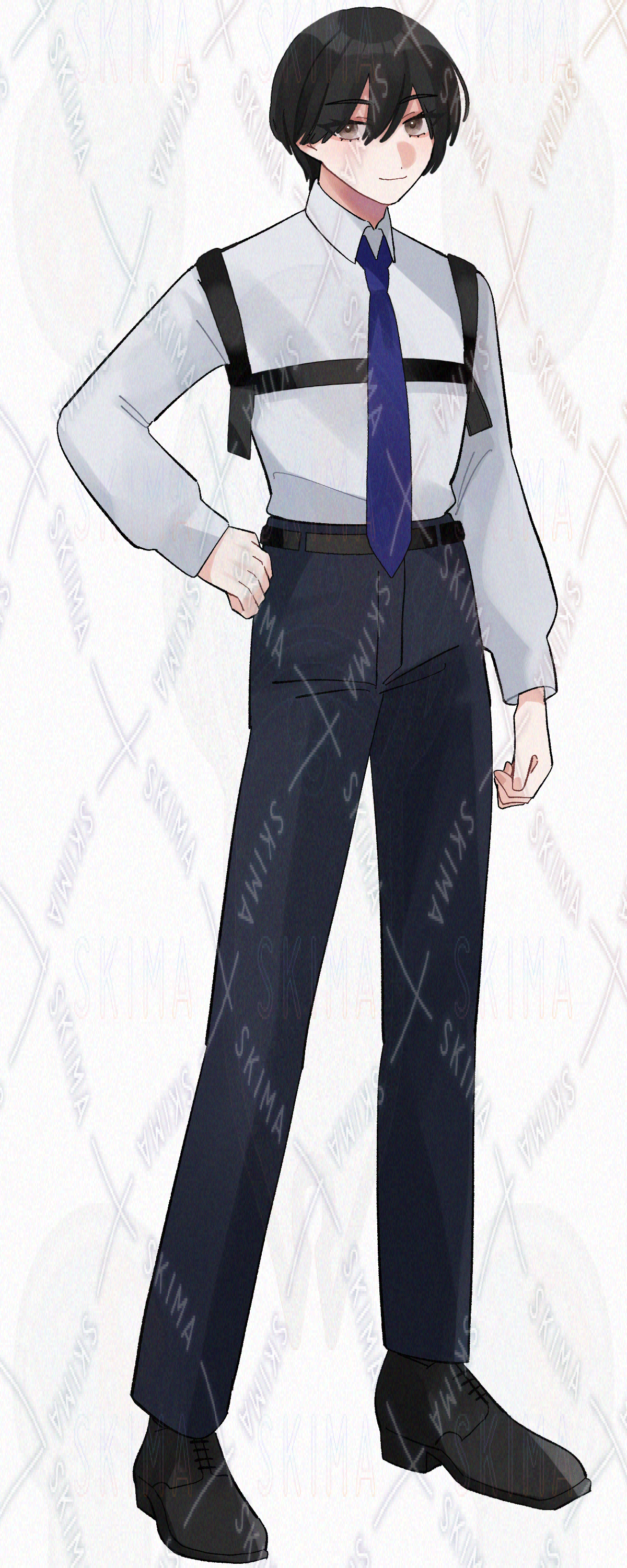ジャケットを肩に羽織った黒髪の男性の立ち絵です。