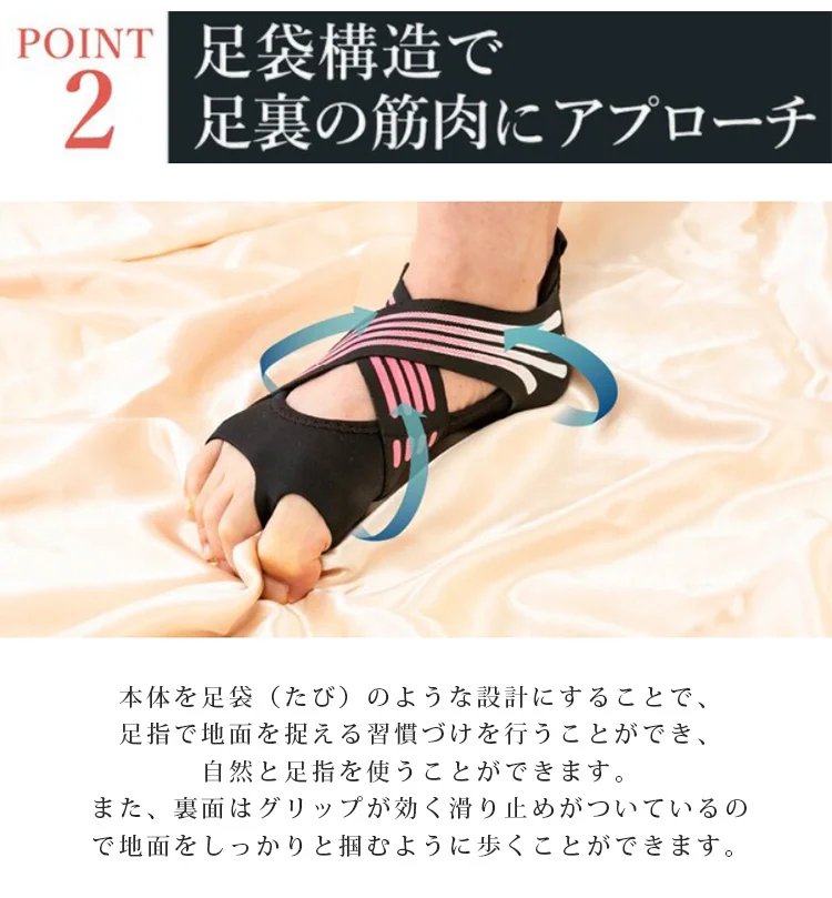 外反母趾で購入しました。指が正しい位置に戻されて地面をしっかり掴んで歩けている気がして気持ちがいいです。