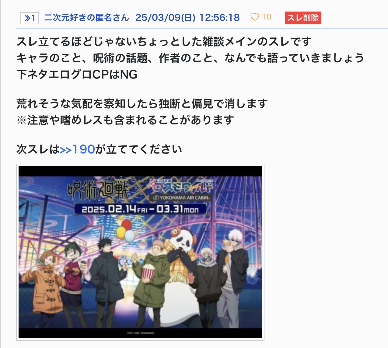 「他スレの話題」「呪術廻戦カテそのものの話題」「荒らしの話題」は一律やめとくかみたいな流れは他所でもわりと見た事ある