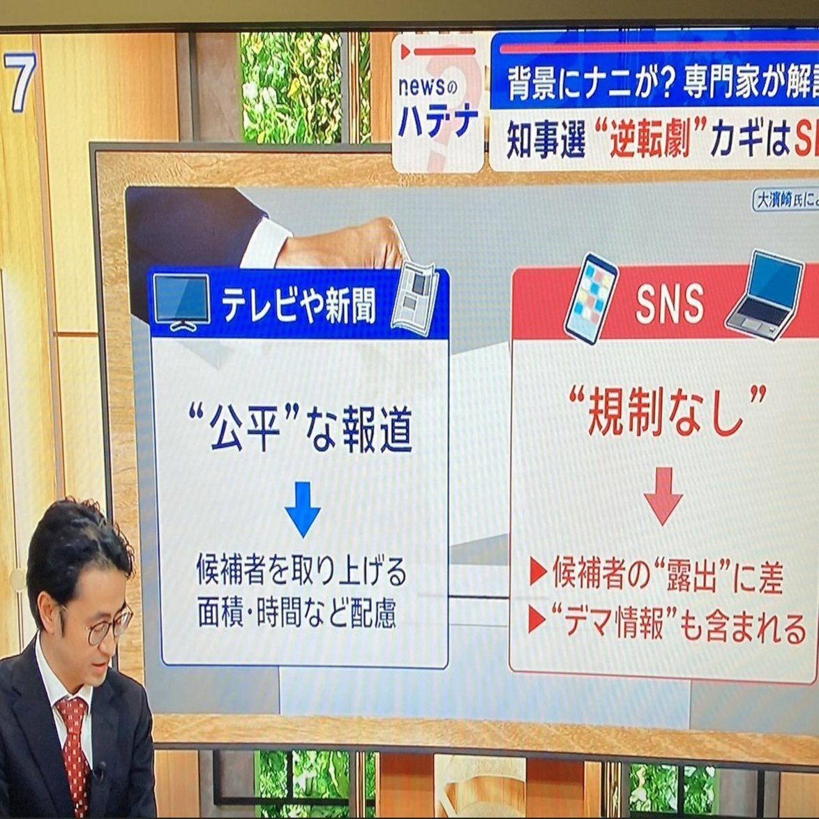 ・もともとテレビ局側の意見というより選挙コンサルタント・大濱崎卓真氏が意見を話す場面での画像。